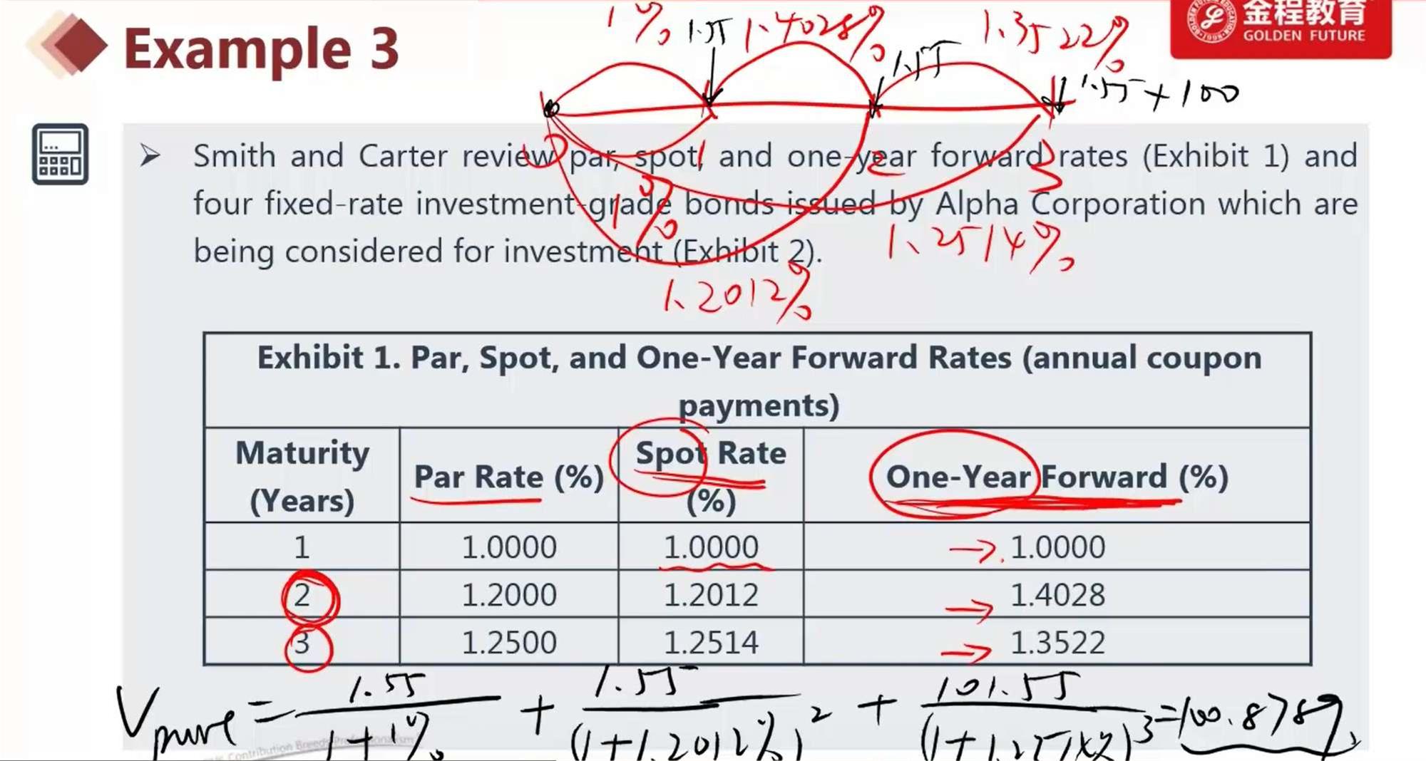 请问这里求Vpure的时候,不能简单用FV PMT 来求,是因为题目没有给出I/Y也就是YTM对吧?另外想问一个比较基础但没理解到的问题,表里给到的三年的par rate应该如何理解(虽然题目没有用到这个数据)?谢谢老师