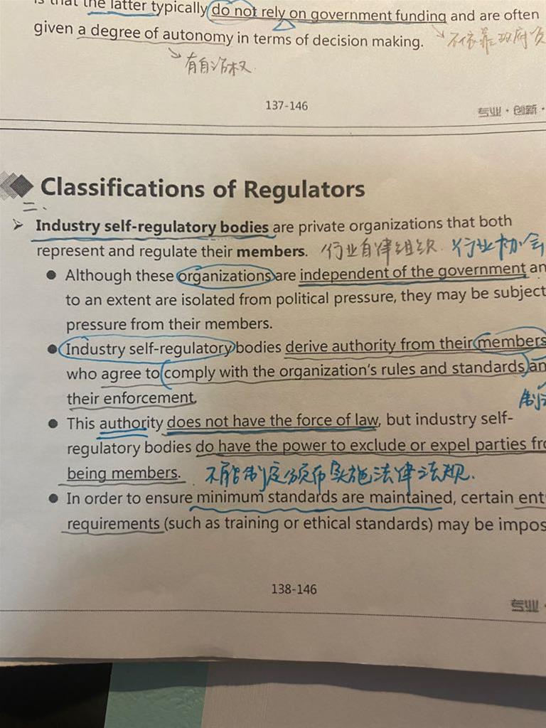老师,在监管者分类这里,第一页老师讲Industry self-regulatory bodies不能制订颁布实施法律法规,第二页讲SROs可以实施法律。但是第二页讲义第一句SROs是self-regulatory bodies的一类,不是矛盾吗?