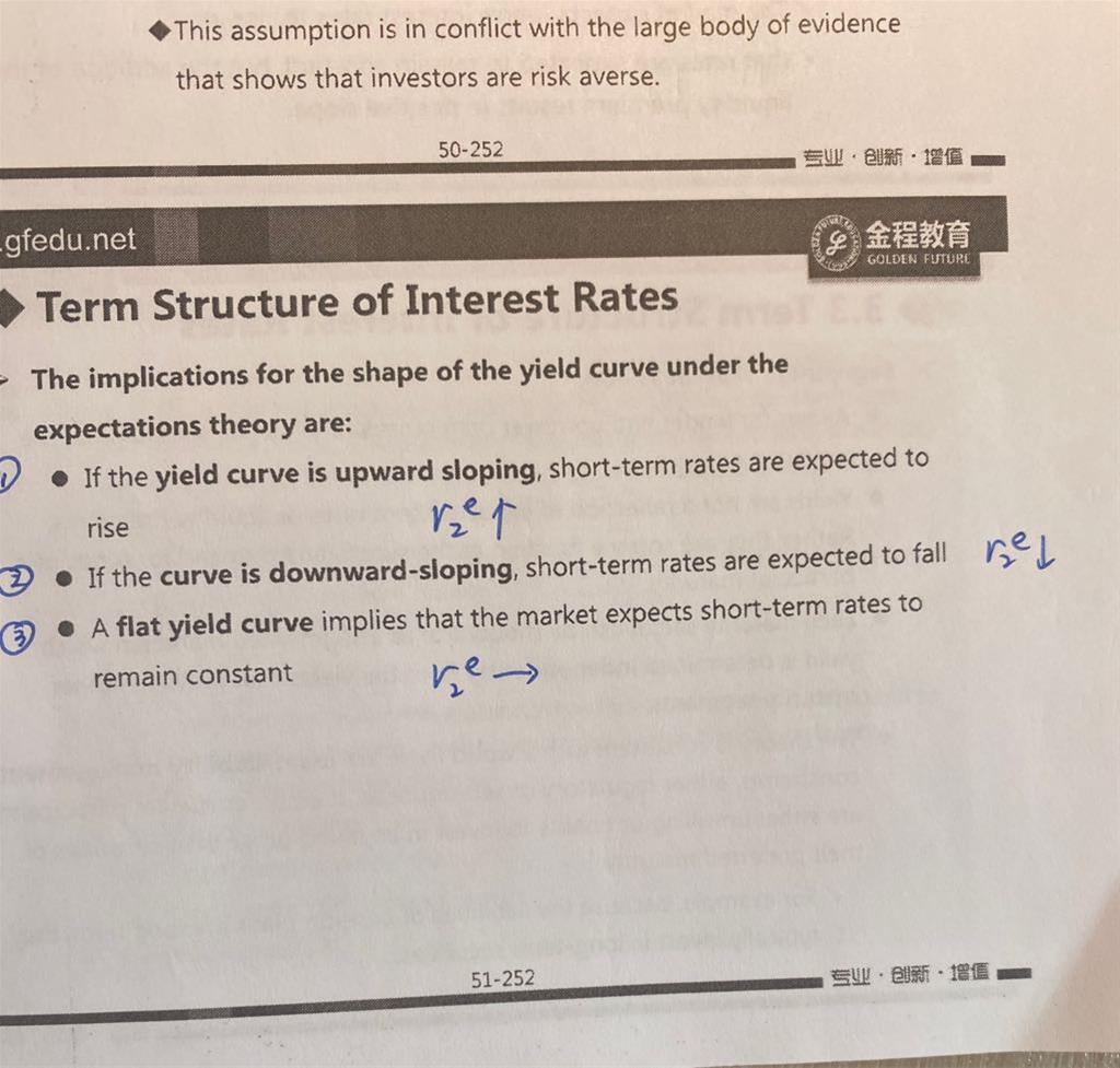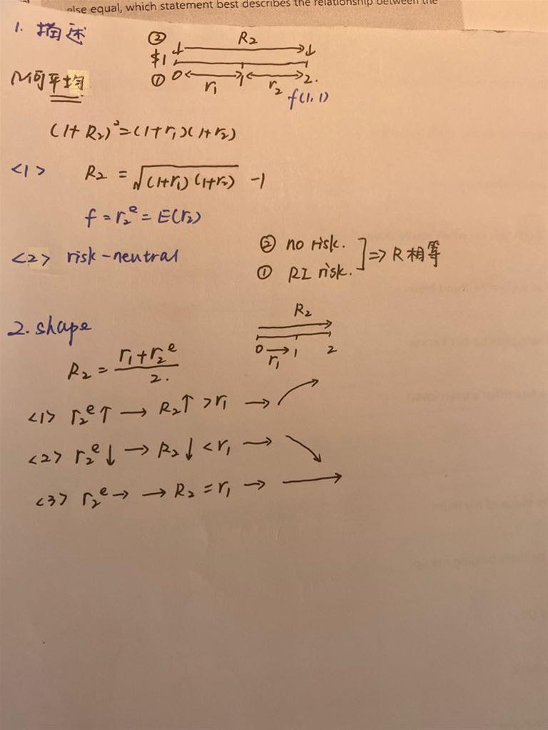老师,这里老师讲的是通过预期小r2 推出大R2与r1的关系(图2),再推出收益率曲线的shape,第一步是假设预期的r2上升。而讲义上写的是如果收益率曲线向上倾斜,短期利率会怎么样,r2是结果。这两个逻辑不是反的吗?