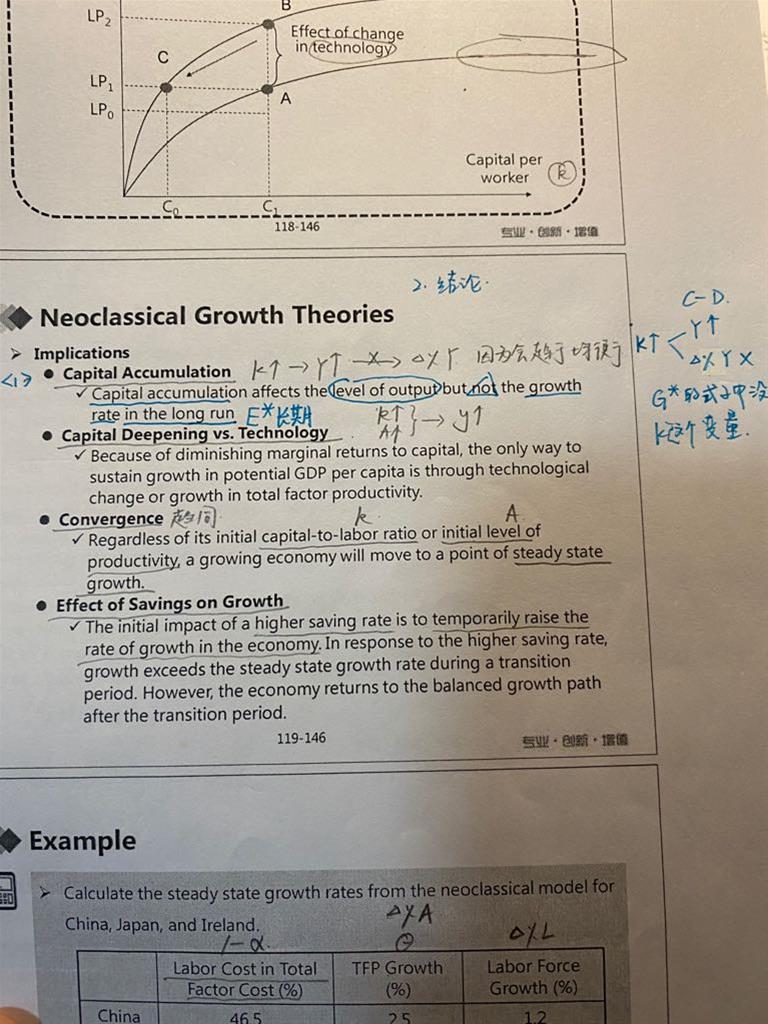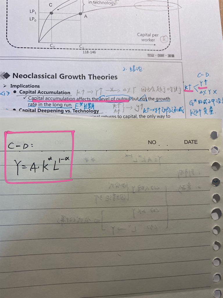 老师,C- D function是在短期才成立还是短期长期都成立?不是说长期要使产出Y增加,只能通过技术A,资本K没用。这里为什么又写到in the long run K可以使Y增加? (粉色笔划线处)