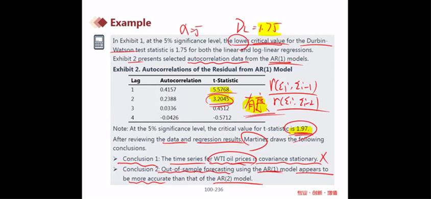 已回答t statistic得出的数是什么的时候,才能得出 autocorrelation显著不为0的结论?r(Ei,Ei-1)这个平整个的中文含义是?我可以这么理解吗?Ho为autocorrelation=0,Ha为atuo correlation不等于0,因为lag1、2在拒绝域中,因此拒绝原假设,所以auto显著不等于0