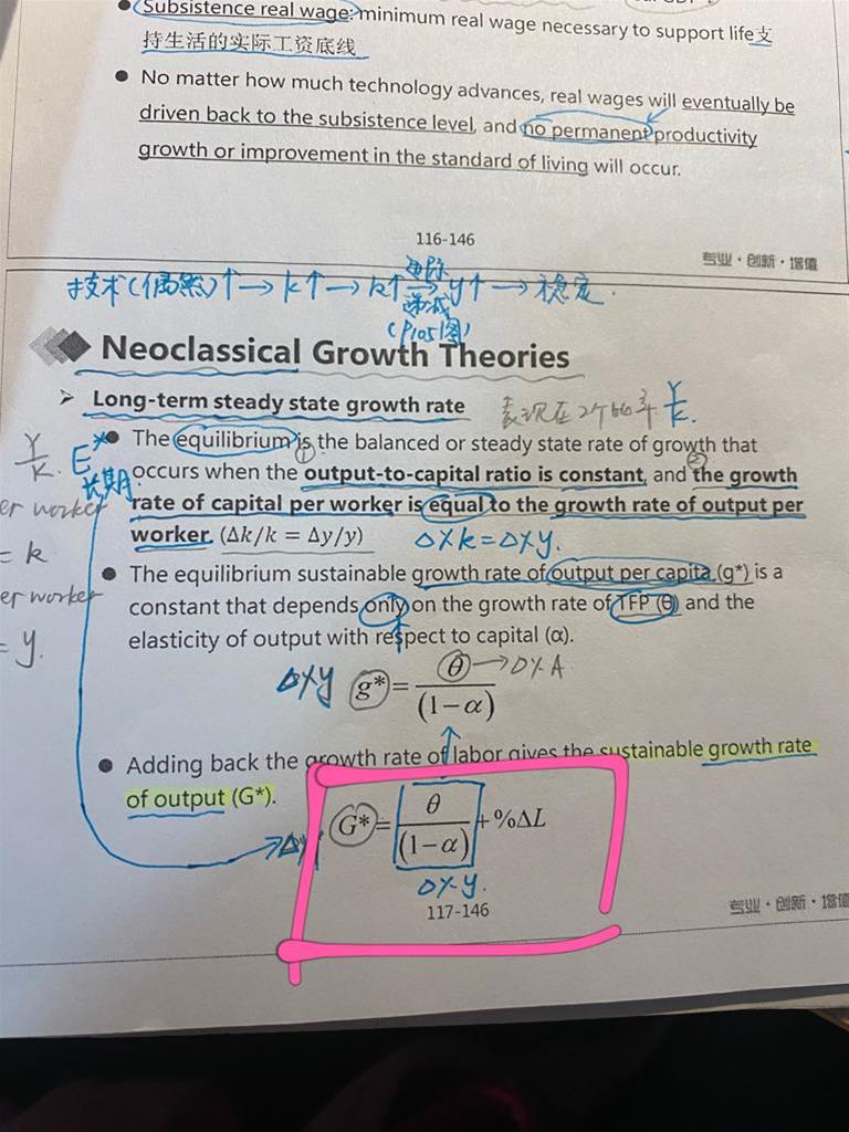 老师,新古典理论这里,老师说长期K增加不会使Y的growth rate增加,因为长期均衡状态G*这个式子里没有K这个变量。虽然G*里没有K,但分母有alpha, alpha代表资本对产出的贡献程度,是否可以间接说明和K有关?