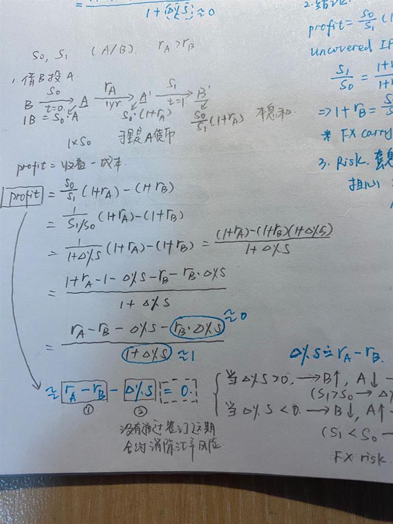 老师,为什么FX carry trade是和uncovered IRP有关而不是covered IRP? Covered IRP, 汇率变化百分比等于两国利率之差,带进去profit也为0啊