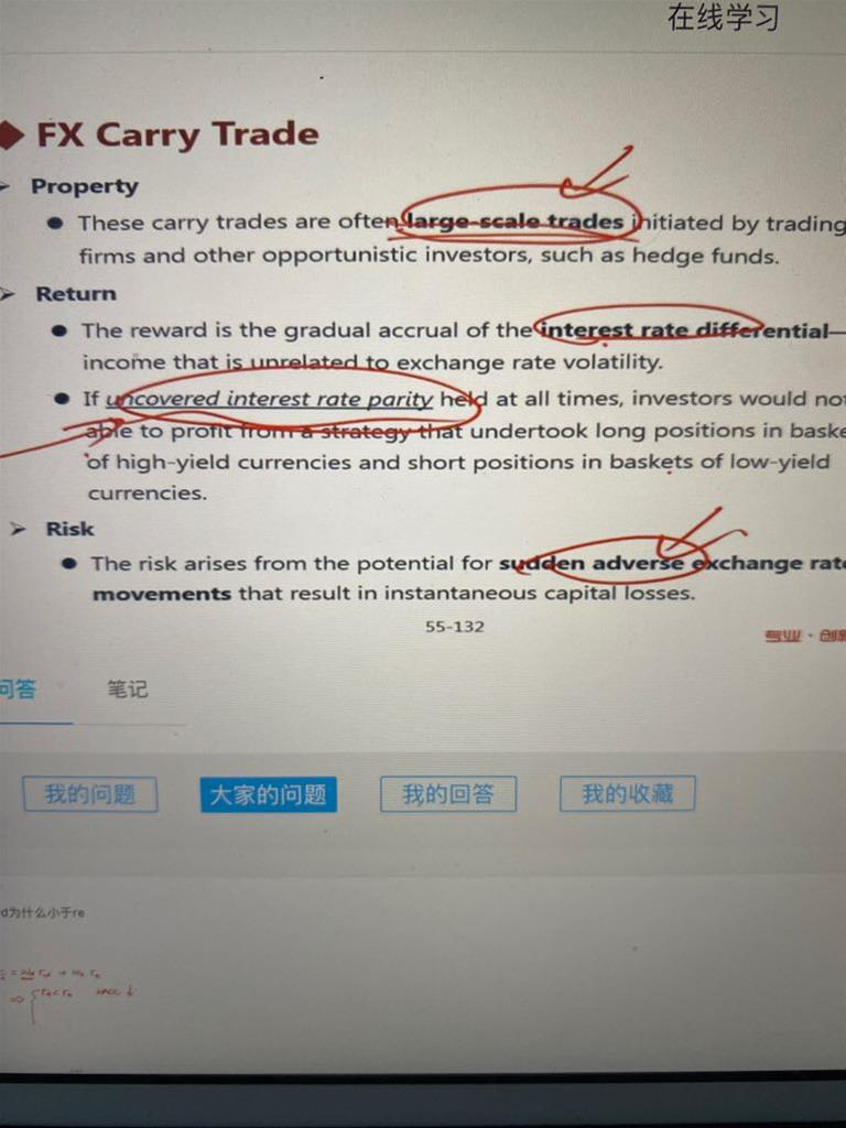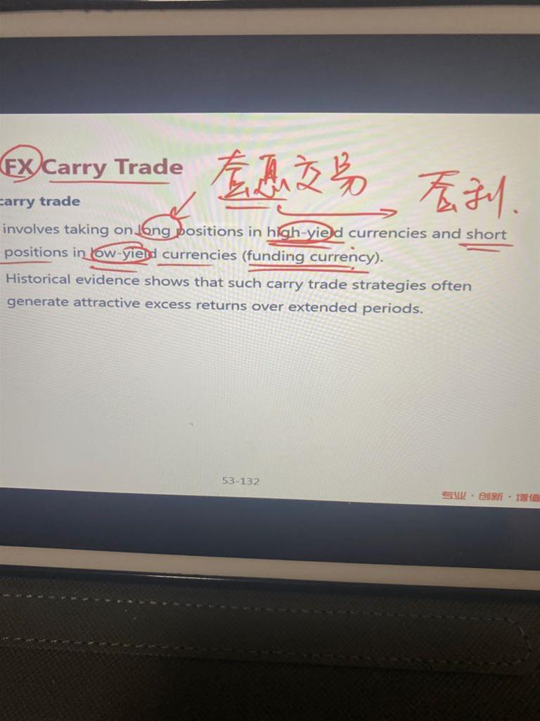 老师,carry trade这里说的long positions in high-yield currencies and short positions in low-yield currencies, 推理过程是不是:因为rA>rB,借B投A,所以要把B国货币换成A国货币,即是卖B国货币买A国货币。(A国利率高,是high-yield currency, B国利率低,是low-yield currency)