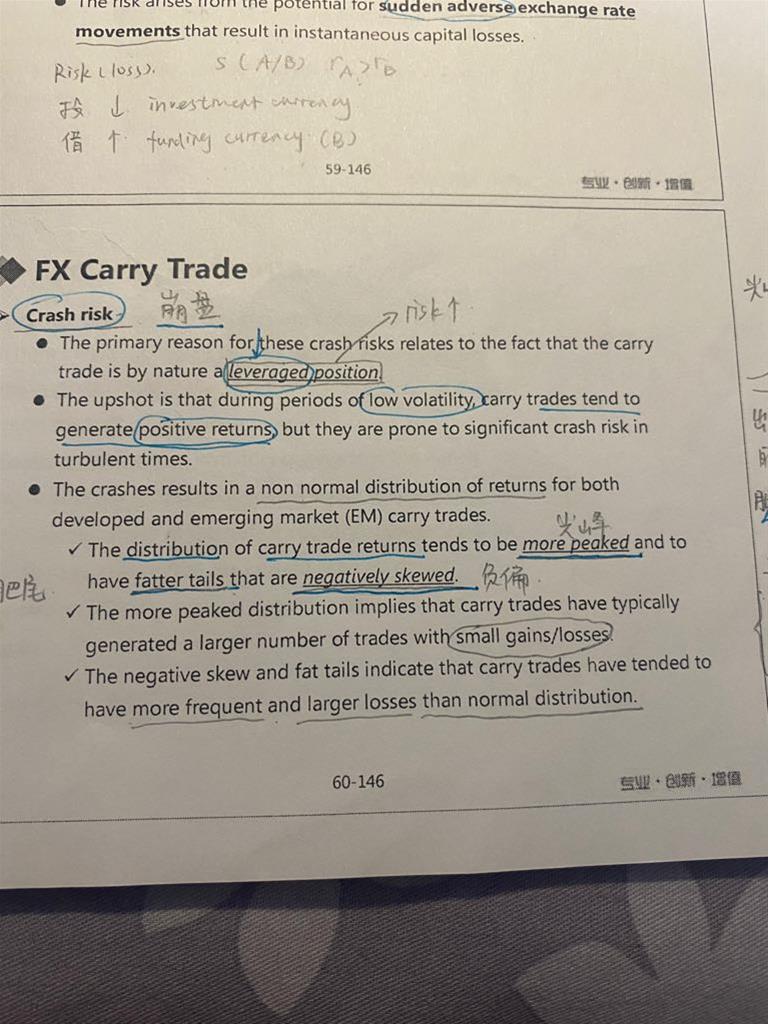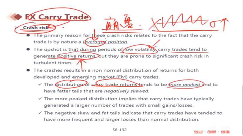 老师,请问讲carry trade return的特征这里,fatter tails我理解,肥尾是说发生极端损失的概率更大,more peaked(尖峰)和negatively skewed(负偏)是什么意思啊?