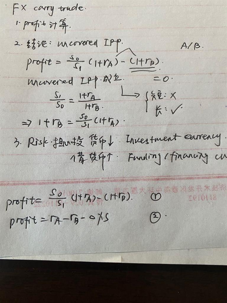 老师,讲到carry trade利润这里,Return的第二句话,如果uncovered IRP成立,做carry trade就没有利润。用uncovered IRP等式代入下面写的1式可以得到profit为0,但如果2式呢? 用2式怎么解释profit还为0?
