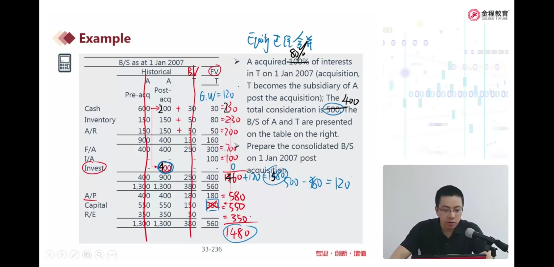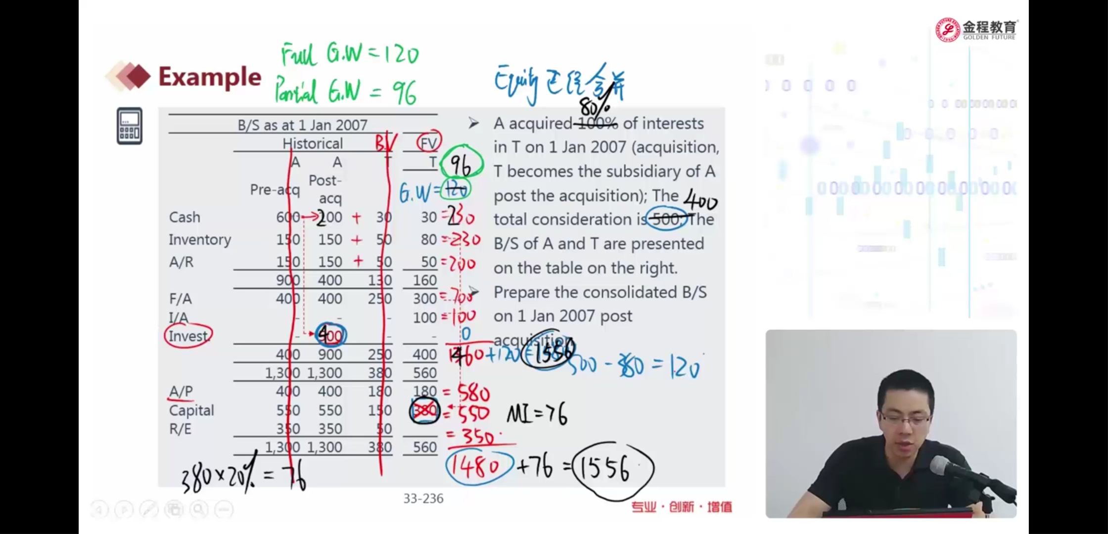 老师,这里如果是按80%比例收购,商誉怎么还是120呢?不是96吗(400-380*80%)?MI就变成了76?