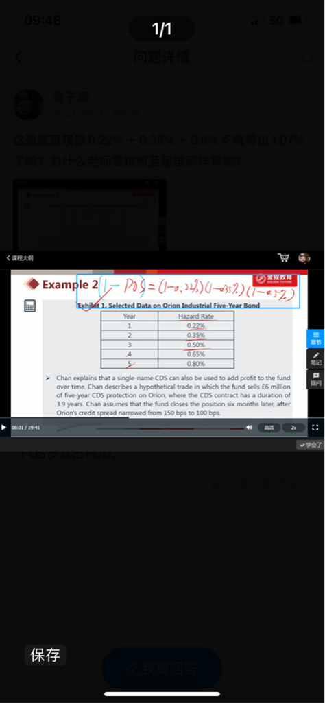 第8题,答案解析最开始算time2的时候,是不是少了一次折现。比如c++情况,是在time2时点有权力借入2.75%利率的一年债券,但是此时spot利率是5%,所以行权以2.75%借入、5%借出因此有利差收益。但这个收益是一年后兑付本息才能实现,所以time2时点的收益应该以5%对利差进行折现啊,但答案没有。
