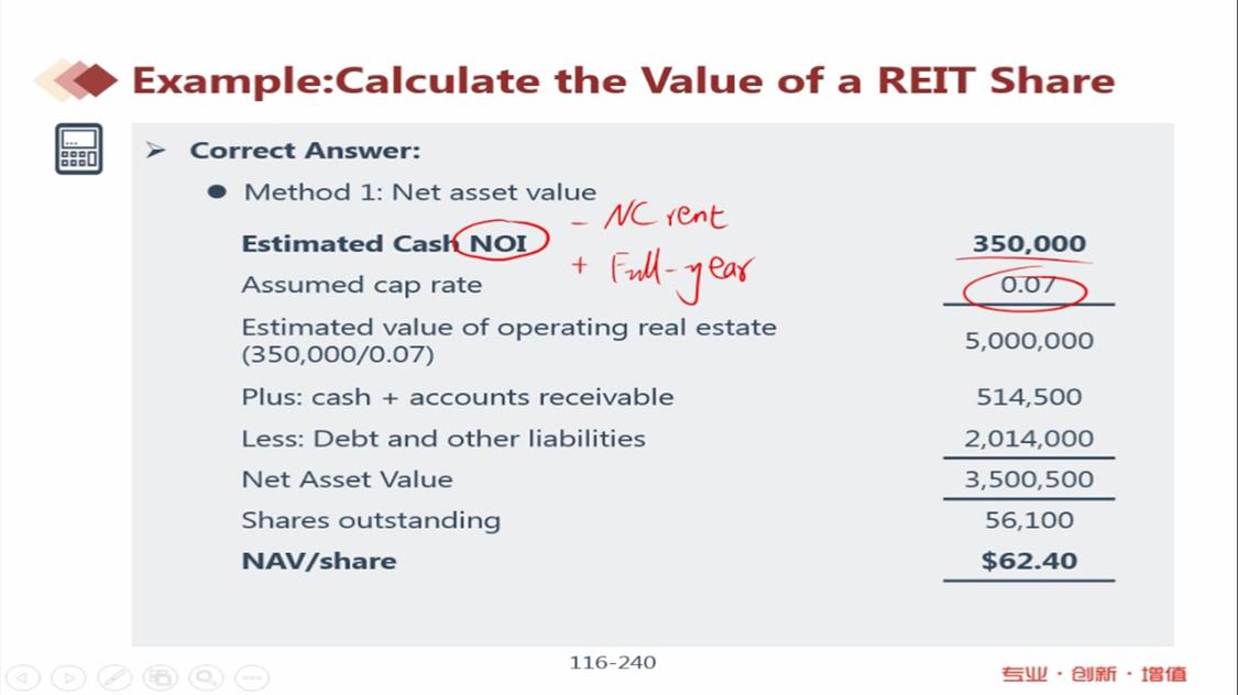 这里的NOI1之所以没有调整non cash rent,我理解的是因为这里已经已知的是NOI1而不是NOI0,所以只需要直接使用即可,如果是已知的是NOI0,那么是需要调整的。您看我理解的对吗?谢谢老师