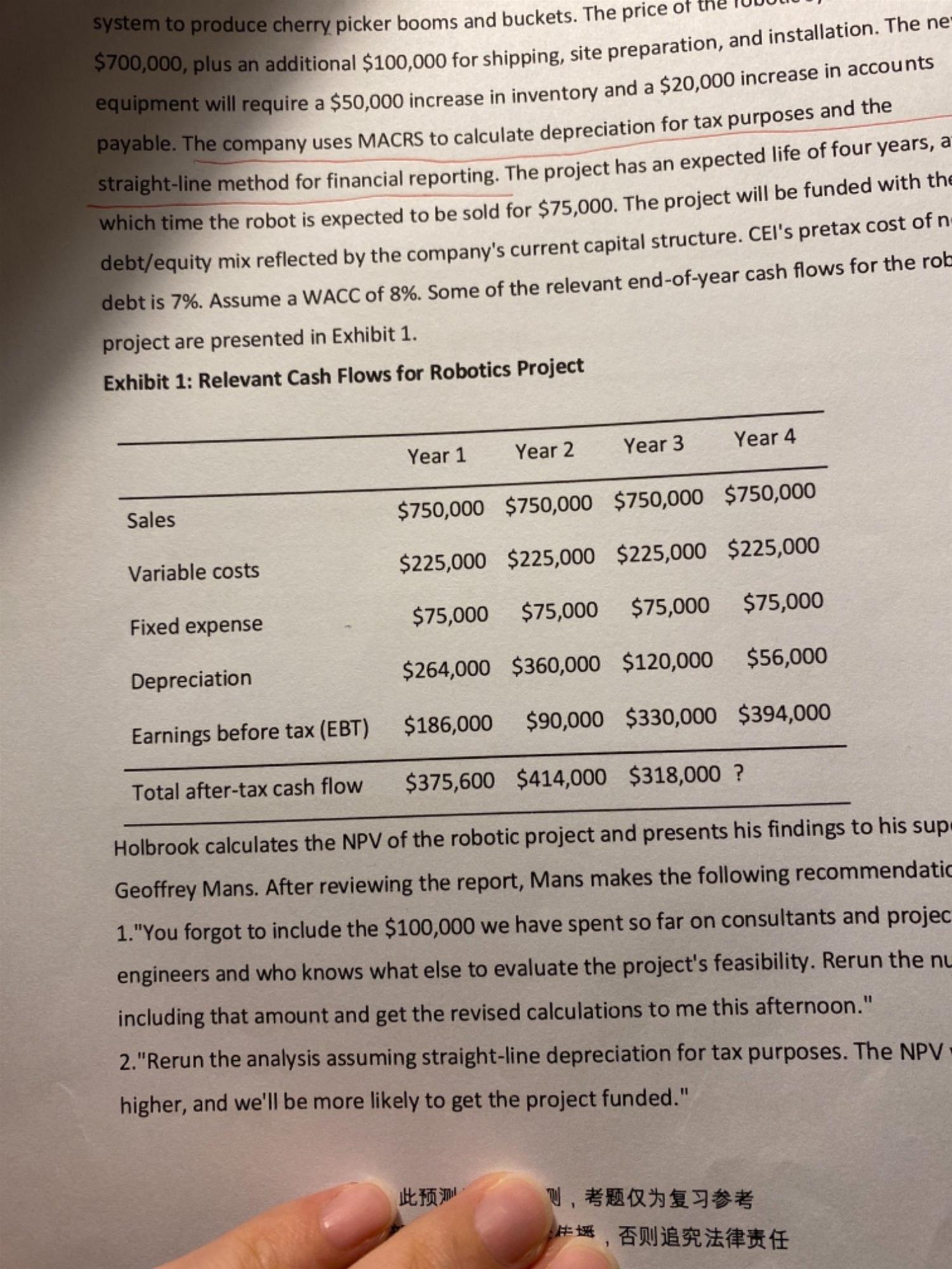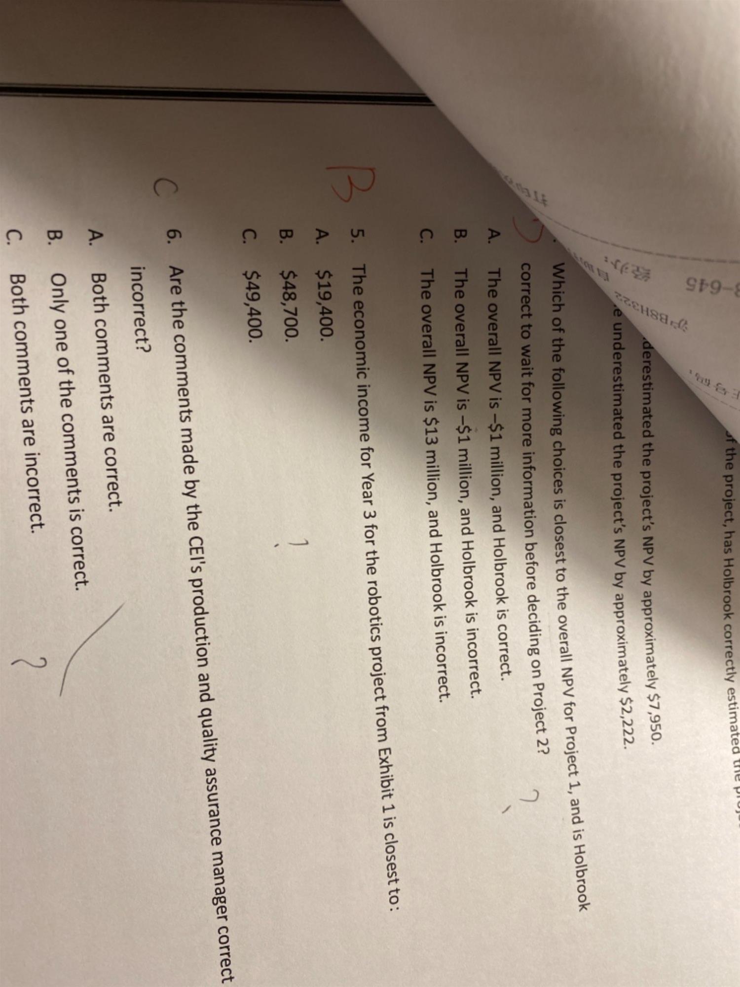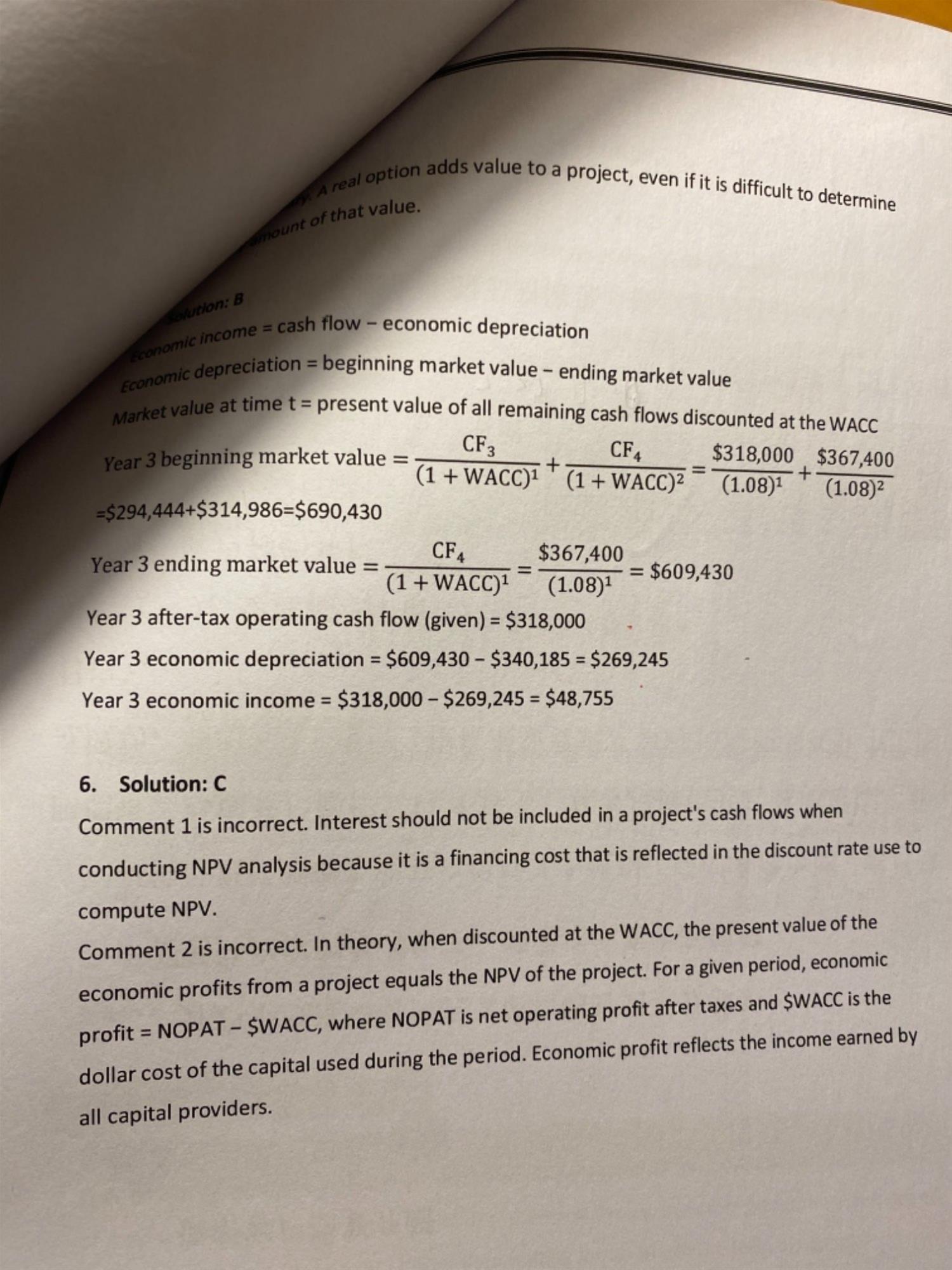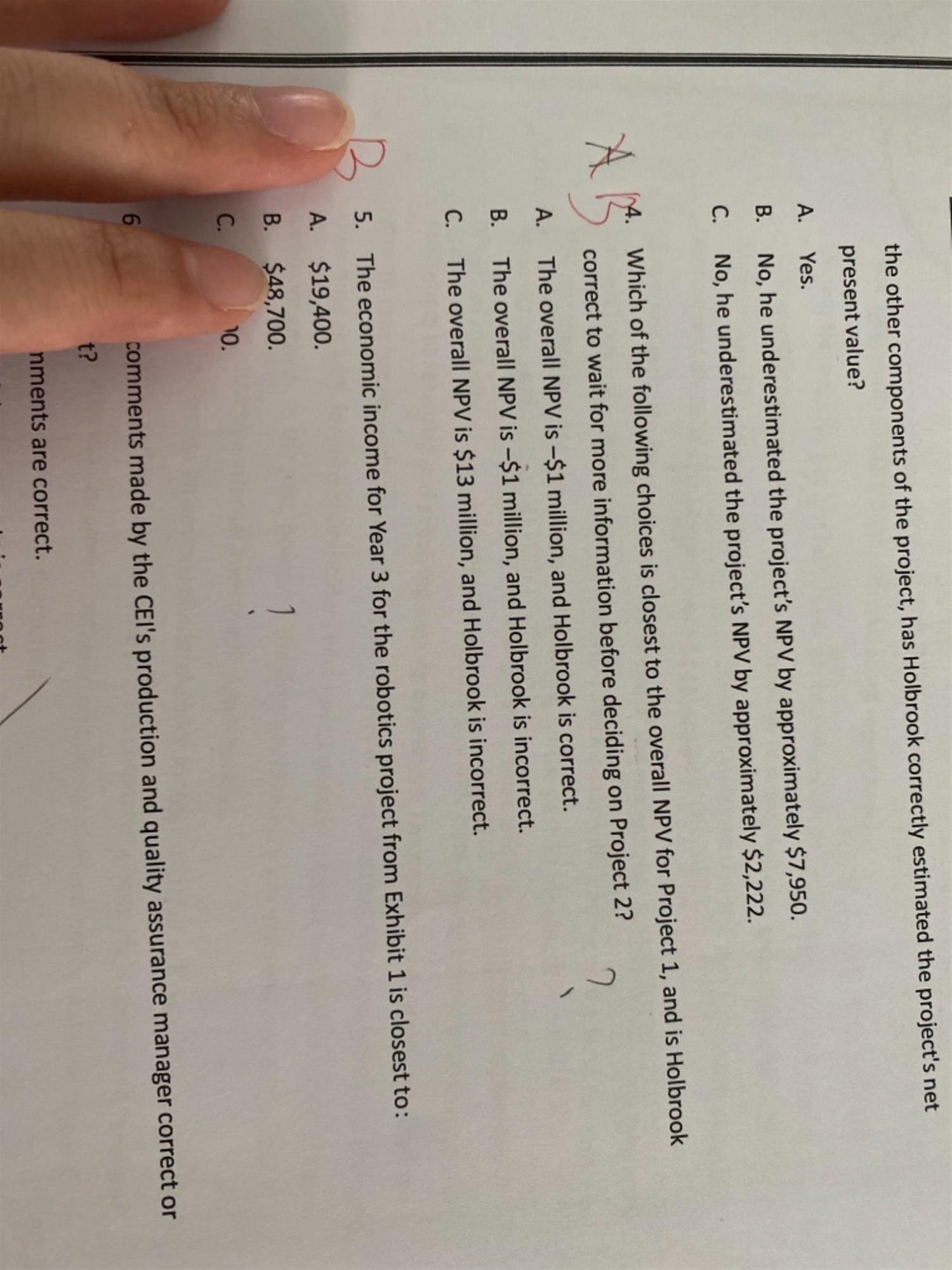 因为overall NPV = project NPV +option value - option cost; 题目中的3M对应的时project NPV,2M对应的是option cost,如果没有Option value,肯定是计算不出overall NPV的 这是答疑老师对于下面这题的解释,我没有看懂。既然老师解释说没有option value计算不出Overall NPV,那么照理说Holbrook的说法就是对的咯?H没法作出决定