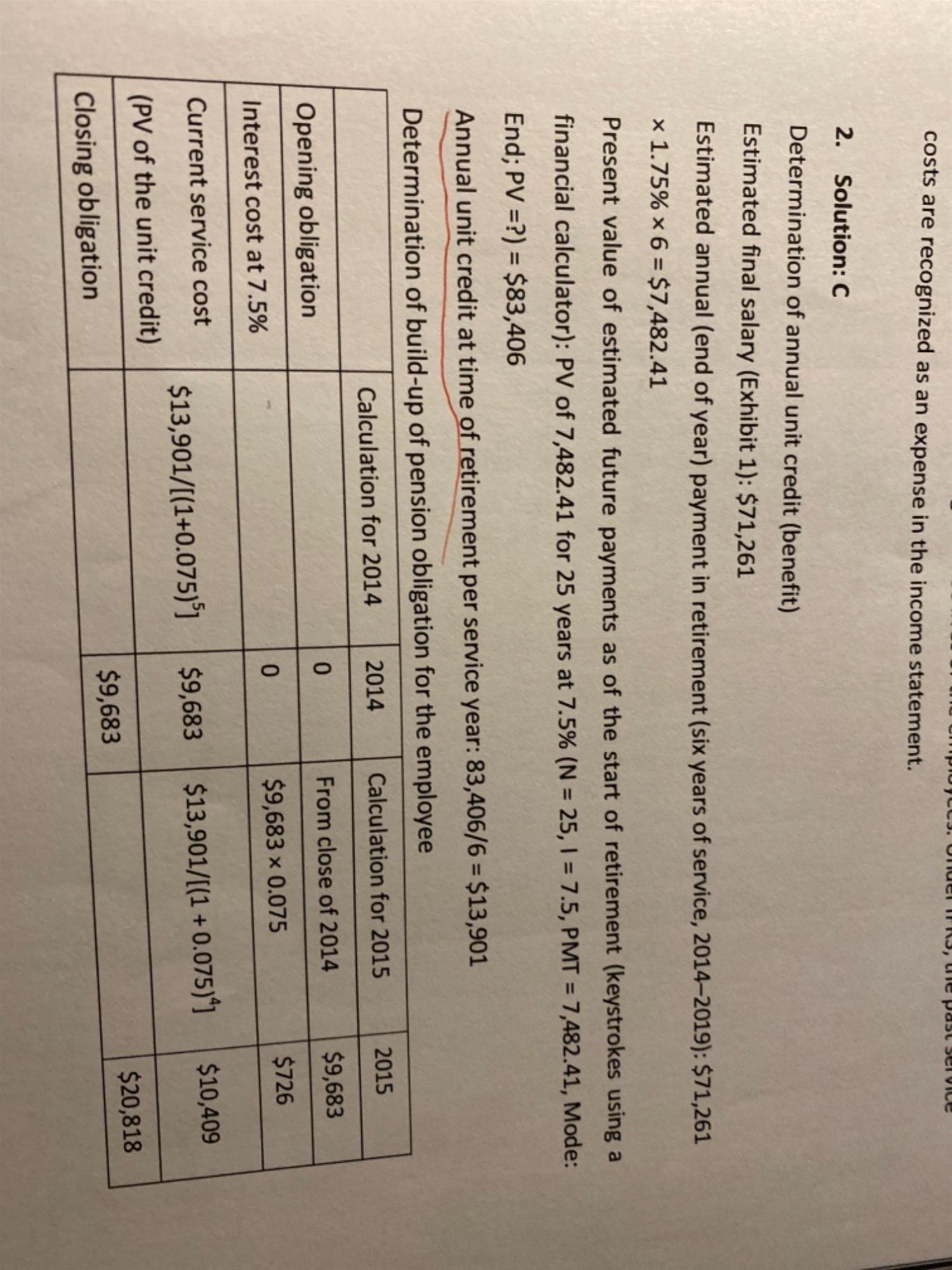 current service cost怎么计算出来的,我感觉看这题解答是用Annual unit credit at time of retirement per service year去折现到当年末,这样计算的逻辑是什么?