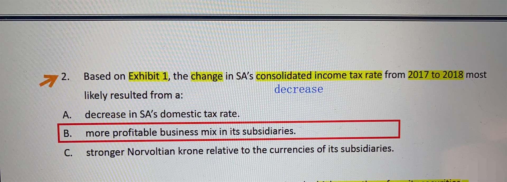 老师 你能讲讲这个财报case 10第二题 为啥选B么? 我理解是因为tax rate on non domestic jurisdiction减少了,consolodated income tax 减少,但是B是啥意思呢,C又为啥不对呢? 谢谢!