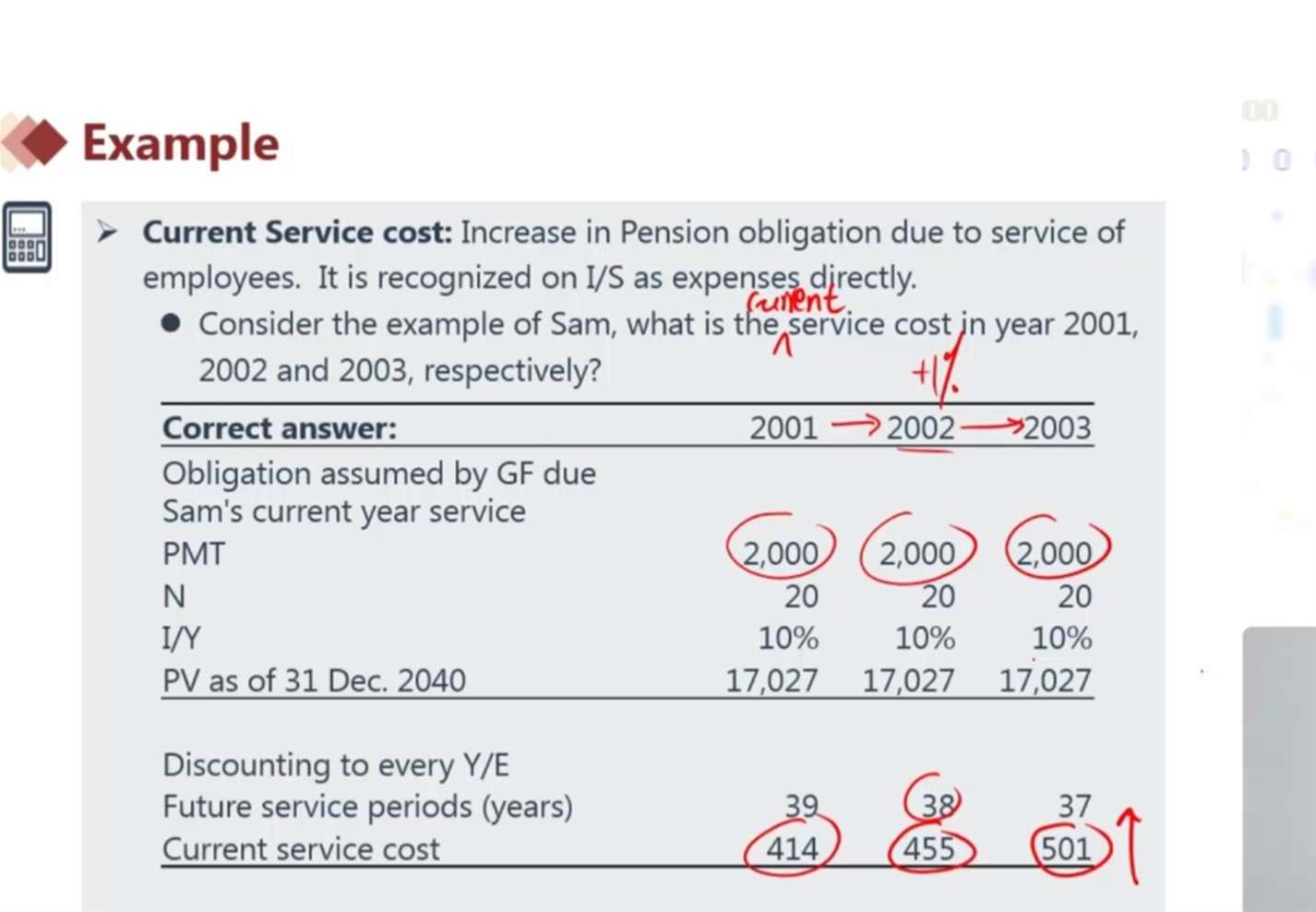 这道题中第2、3年计算CURRENTSERVICECOST为什么不用退休前工资乘以2%和3%?工龄增加了,每增加一年会多付1%,为什么到了第2、3年的payment还是一样的?
