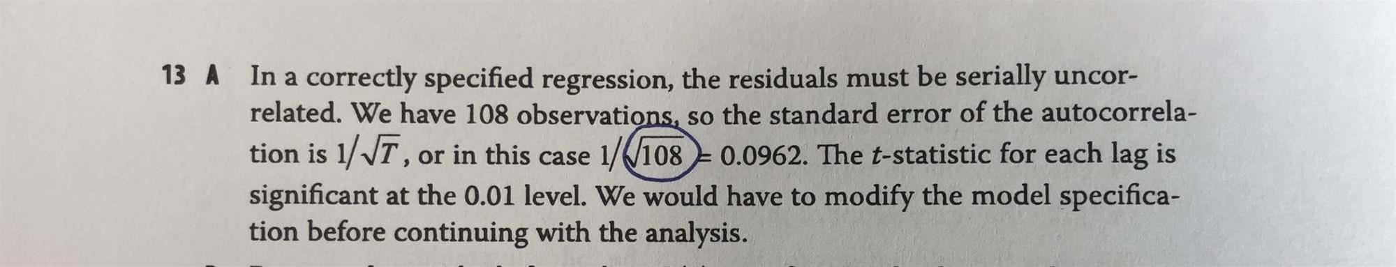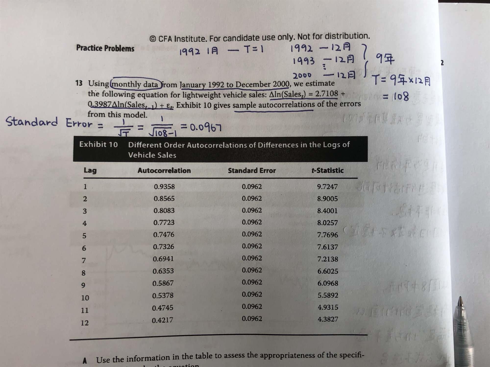 老师 这边1992年1月-2000年12月 一共是108组样本容量 且为AR(1)模型 计算自相关系数的标准误中的T不应该是“样本容量-1”吗?即108-1=107