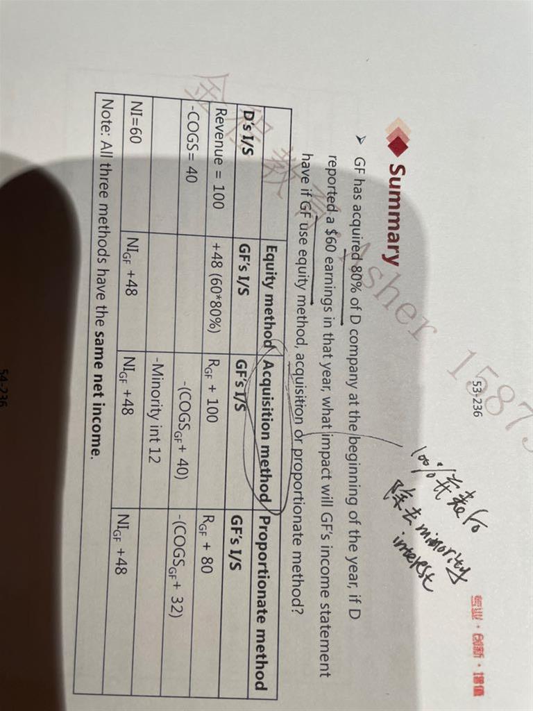 想问一下关于三种方法下equity大小的问题 acquisition下增加了100%equity(包含minority interest)我能理解是最大的 那proportion增加了80%的equity 会小一点 也ok 那权益法它没有并表 为什么equity会跟proportion一样呢? 跟NI结转至retained earnings有关系吗?