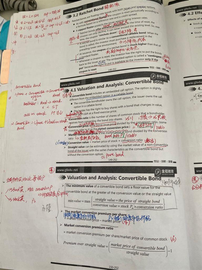 1.一图 ppt136 我打问号两句话 不矛盾么?2. 二图ppt145 这道例题我没明白为什么7.2%即可以是coupon rate 又是折现率啊?您能帮我区分下收益率 折现率 利率概念么?3. 三图 ppt150 mini value公式我不理解 麻烦您讲一下~ 4. conversion premium = 转换股票市场价格- 当前股票市场价格么?
