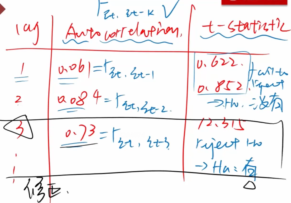 老师举得这个例子中t和t-1的correlation为0.061,且t检验为0.622,不是说明t和t-1也不存在aotucorrelation吗?那最终的模型应该也没有Yt-1才对?