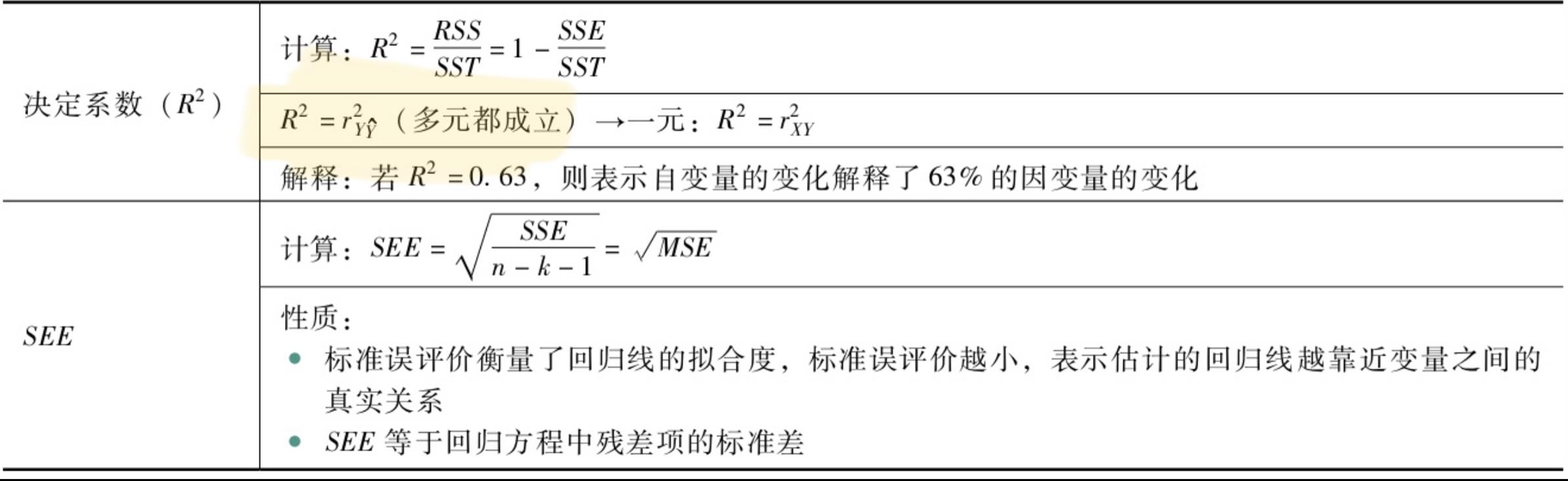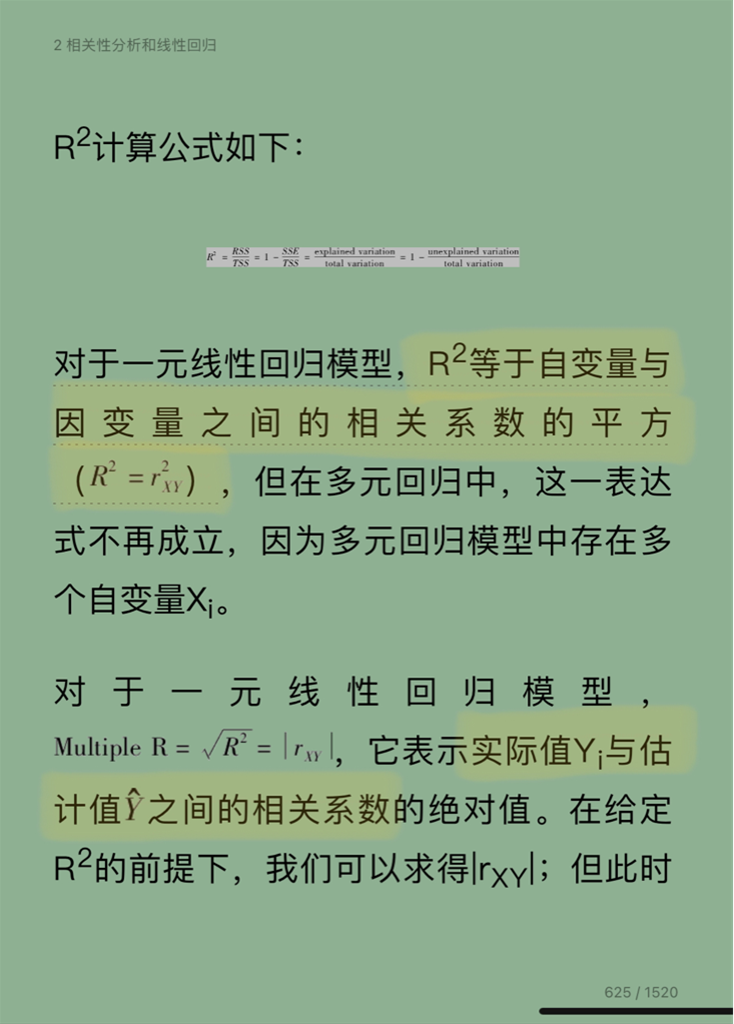请问标黄的地方该怎么理解 为什么上面说R2等于自变量与因变量之间的相关系数的平方 下面又是multiple R表示实际值Yi与估计值之间的相关系数的绝对值呢