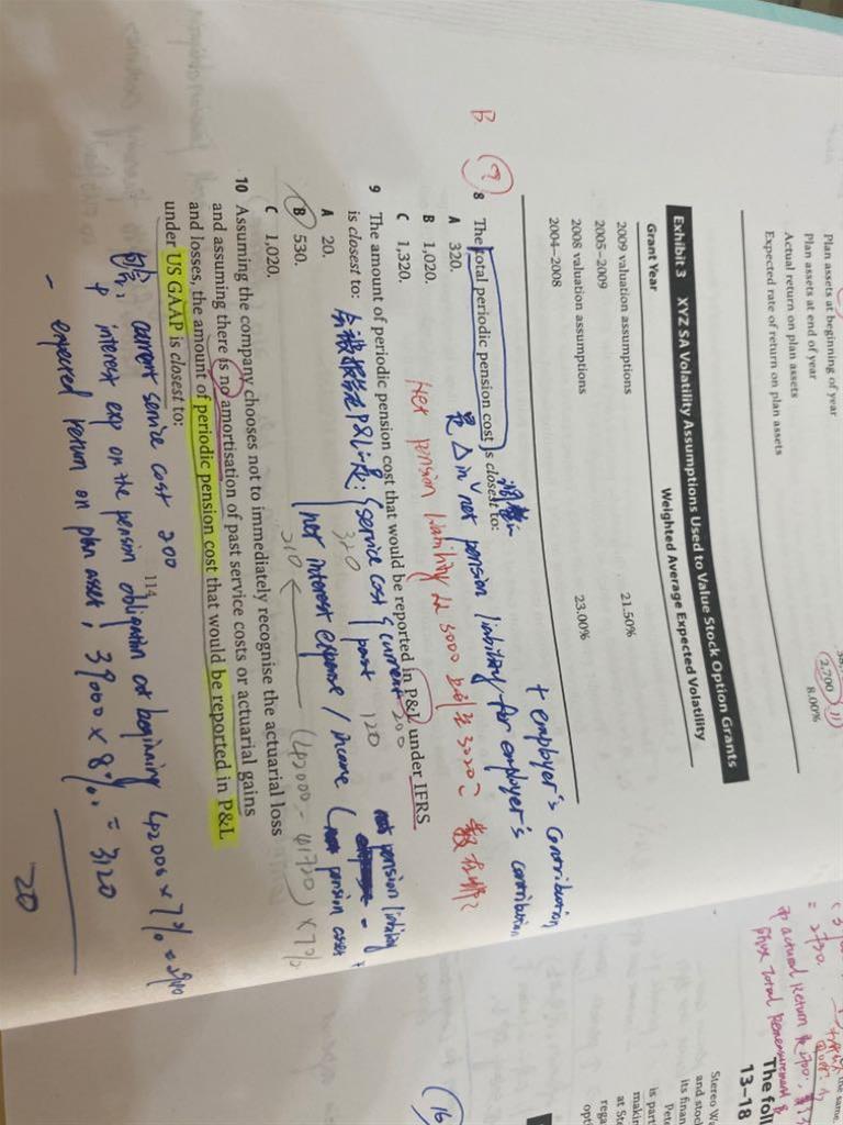 115页11题,为什么用Discount rate 而不是expected rate of return? 12题,什么是volatility assumption? 玫红色字体 计算plan assets at beginning of year, 为什么用0.07 而不是0.08?问的不是2009年吗?