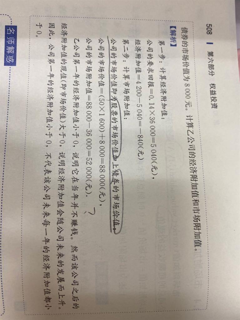 老师您好,精读里的这道题,MVA是EVA的折现现值啊,怎么这里是88000-36000呢?突然看不懂了,请老师解释一下,谢谢!