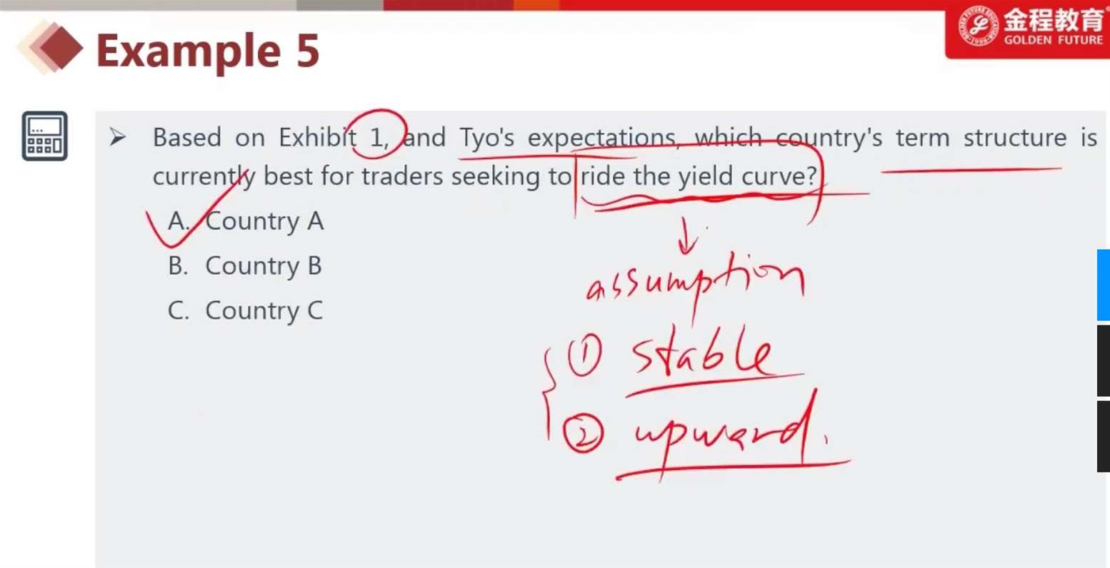 老师您好:能不能再解释一下这道题,B国和C国的yield curve究竟是怎么变化?文中最后一句是一开始的状态还是最后yield curve的状态?然后这边的2个assumption如果是同时满足的话,stable之前提到slope不变,但是A国的slope最后一年也有变小,是否考试中也是这样判断?还有能不能解释一下这道题是否可以用p83页那个table解释。谢谢!
