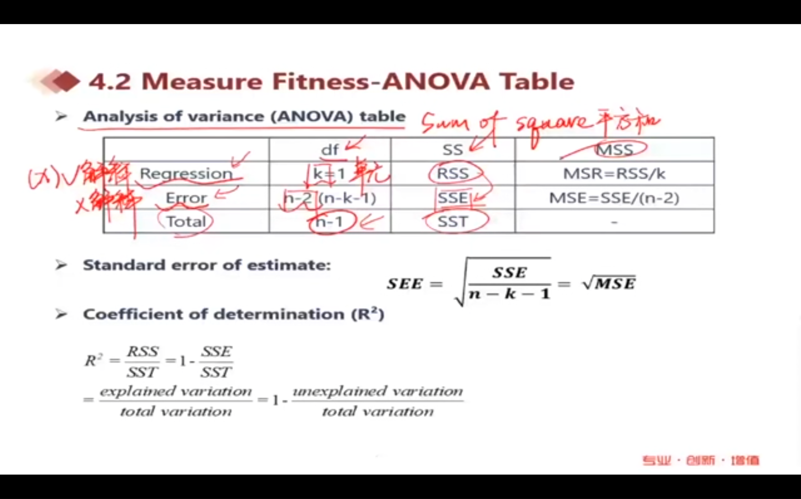 请问一下老师自由度到底应该怎么理解?前面说单元回归的自由度等于n-2,因为受到b0和b1的影响,这里又显示单元回归的自由度是k,单元回归残差的自由度是n-2,有点乱