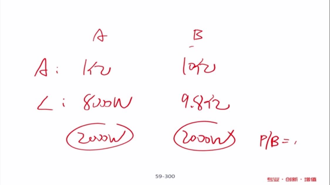 这里老师讲P/B没有考虑规模差异,举了这两个公司的例子。但是P/B中的equity其实还是要除以总的普通股股数的呀,所以根据老师举的这两个例子并不能说明问题,而且两个公司的股票价格P也不一定相等啊。请老师再解释一下,谢谢!