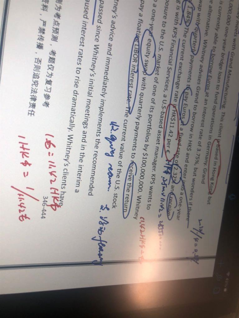 - 第六题,视频老师说,对于汇率都是先除老汇率再乘新汇率,不应该吧,对于这个客户而言,因为“paying €1 million at inception.“得出该客户是未来每期是收欧元利息和欧元本金,支瑞士法郎利息和本金。所以期初是每一欧元换1.12瑞士法郎用的是乘呀,估值时的汇率1.1用除。老师帮忙看看逻辑正确不?