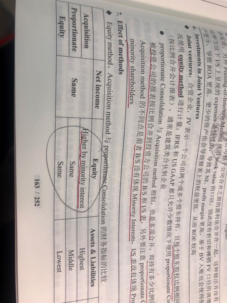 关于三种方法下Equity的比较,合并报表是最高的因为有少数股东权益并入Equity,但是按比例分配法下Equity为什么会和权益法下Equity一样呢?因为按比例分配法下资产和负债都是按实际比例合并,就没有多余的少数股东权益,但是比如资产和负债分别按50%合并后,Equity也应该多了50%吧,怎么和权益法下Equity一样了呢?权益法Equity是完全不变的啊。