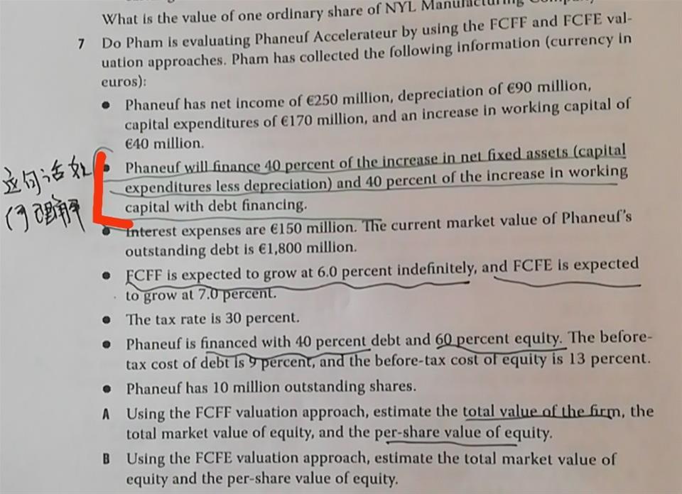 老师第7题我画红线那句话怎么理解,这道题为什么fixed asseted增加了,在计算FCFE是没有把增加的给减去。Wc也是增加了40%,为什么不把增加的WC减去。