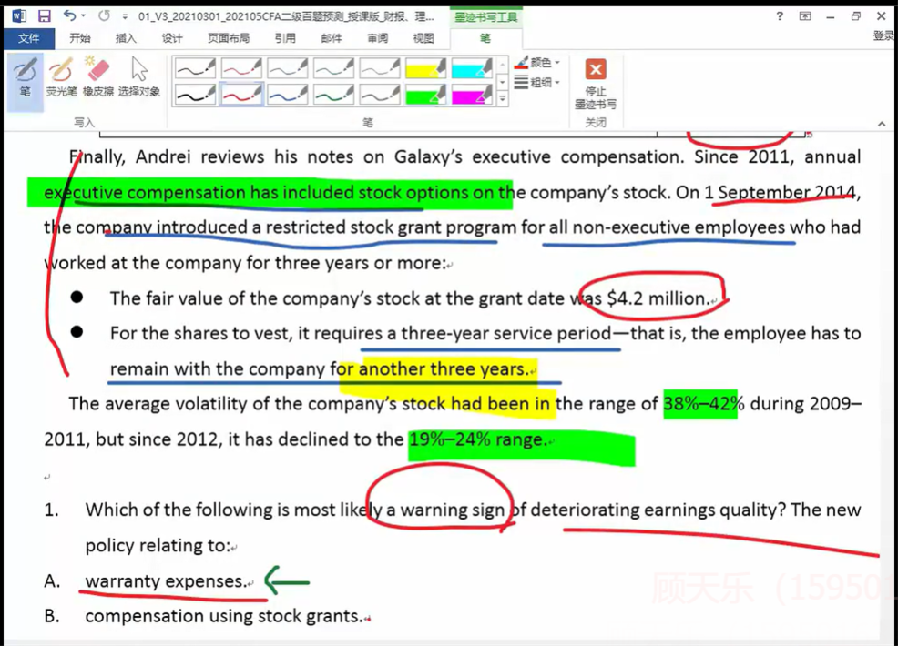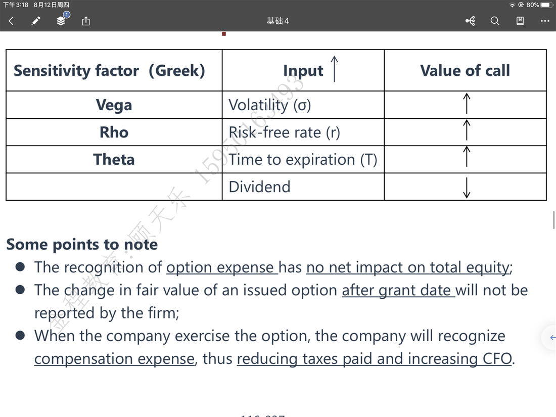 请问第一张图片是ppt的,其中some points to note第二条,说grant date后,FV of option不会影响expense了。可是这里第二个图片的题目,volatility会影响Voption,答案也说了会影响executive 的 compensation expense,这里似乎矛盾了该怎么解释?