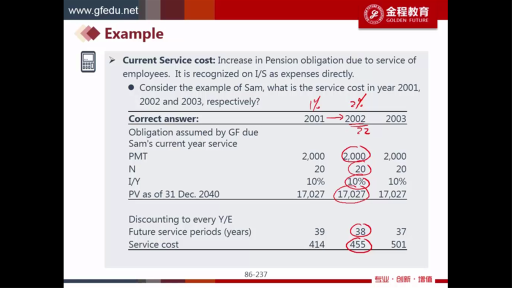 老师好,请问current service cost是一个增量的概念还是累计的概念?比如图上这个例子,每多工作一年公司多交1%,那2002年的csc是只针对增加的1%(即2000元)对应的现值吗?是455而不是(414+455)?