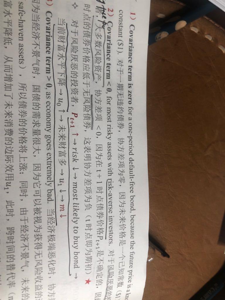 老师对于风险厌恶的投资者,为什么会有Pt+1 上升,risk下降?更多去买债券,当前财富下降,当前边际效用减少,为什么未来财富就多了?麻烦老师解释下划线这个逻辑。还有书上说在t+1时点债券价格Pt+1是不确定的,那么怎么就一开始是Pt+1上升了呢?