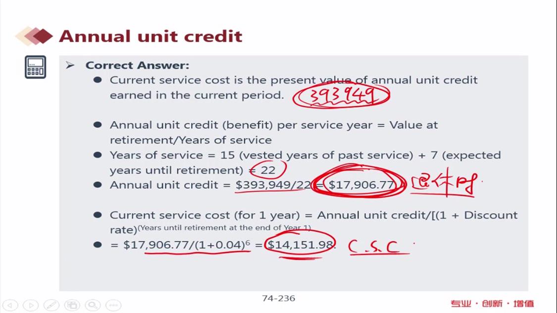 老师您好,这种annual unit credit method怎么可能跟折现算出来的current service cost一样呢,感觉这种方法不太科学,没有考虑时间成本啊!请您再解释一下,谢谢了🙏