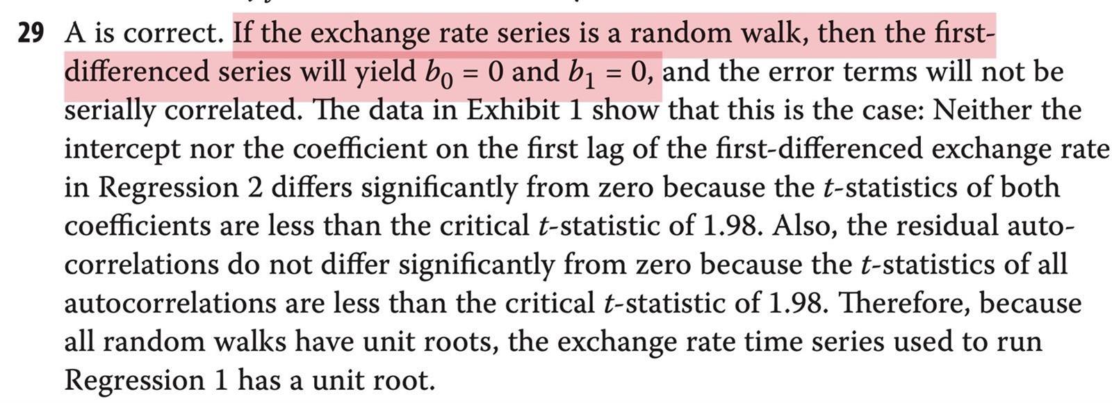 老师R6的第29题,答案上标红的这句话我不理解,有单位根不是指b1=1的时候有单位根吗?为啥这里说是b1=0的时候??麻烦老师再详细讲下这题为什么选A,讲解视频里老师完全只读答案。。。