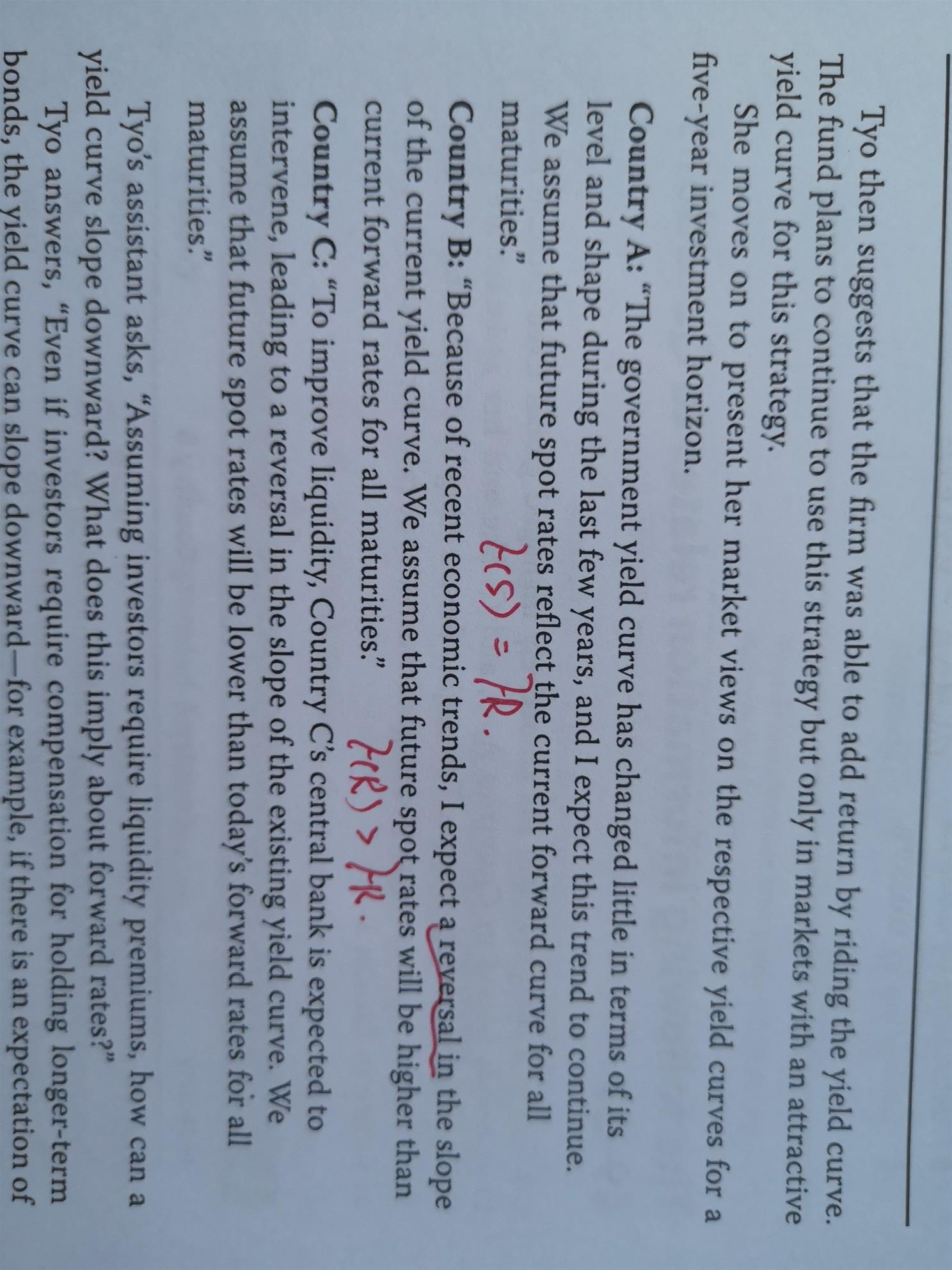 老师,请问riding the yield curve是不是指forward rate大于spot rate是曲线是向上倾斜的?这道题里比较的是expected future spot rate 和forward rate我就不是很懂了,老师讲的country B的情况,expected future rate大于forward rate曲线是向上倾斜?为什么啊