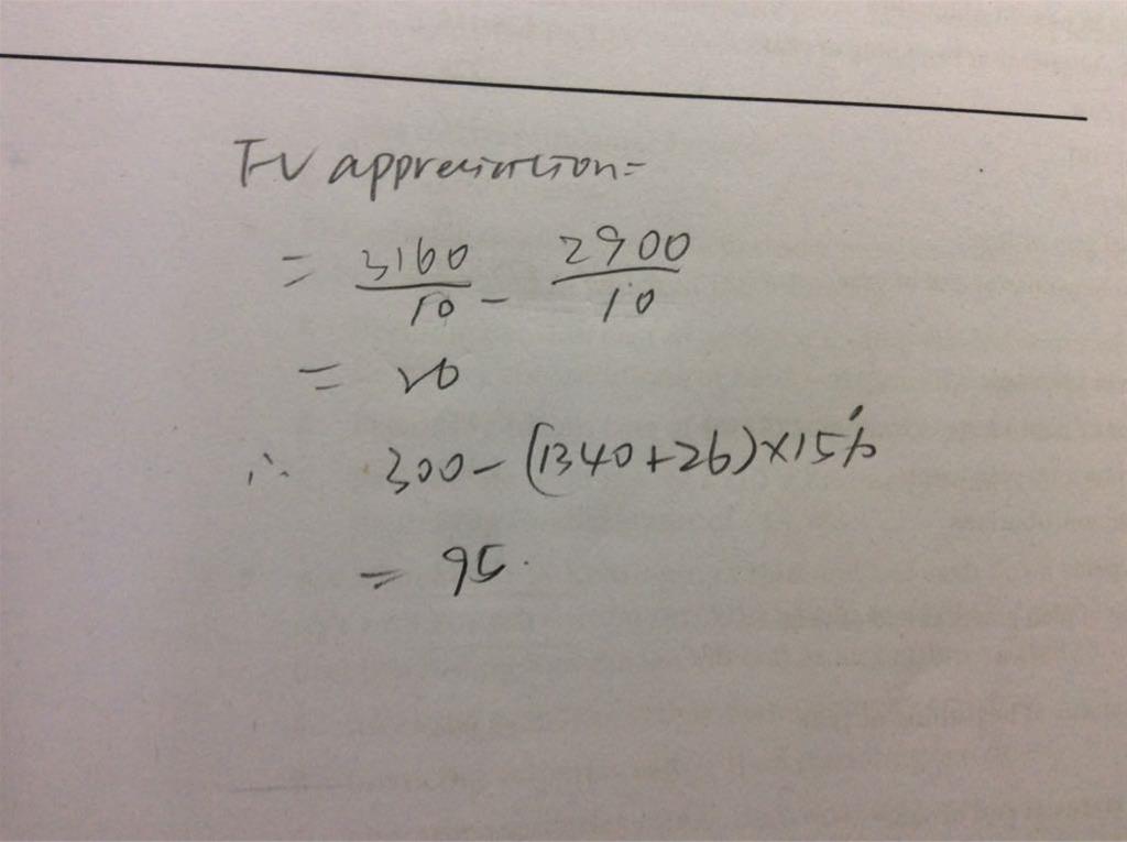 这题为啥不能先求FV appreciation 再加BV再也就是FV 再乘以15% 在用三百减去这个FV?
