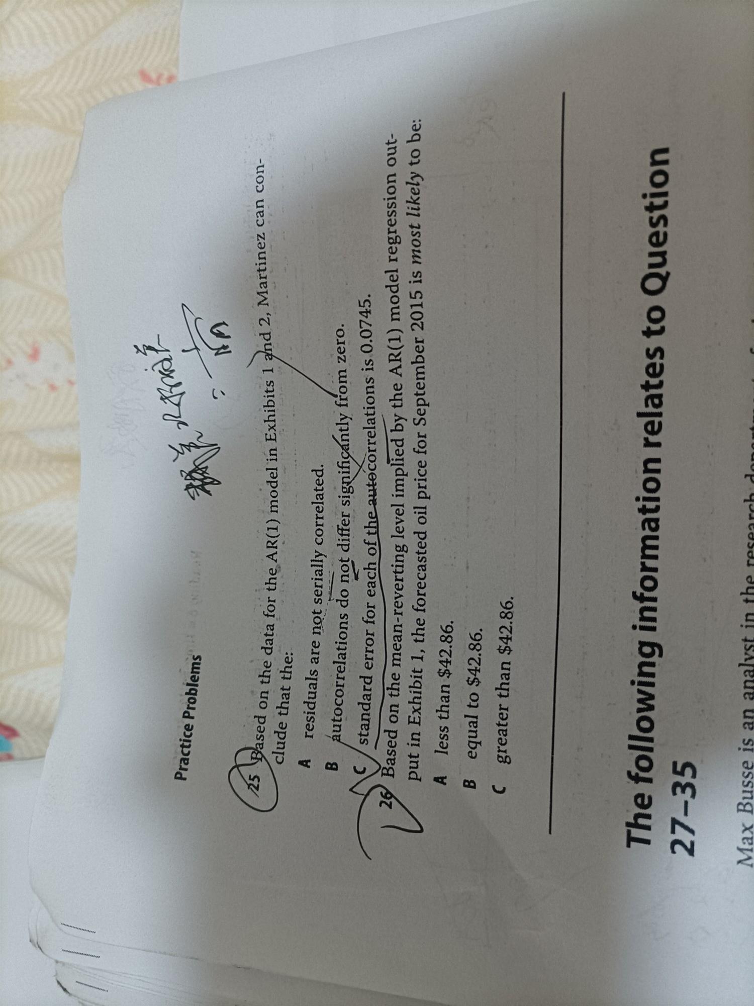 你好,原版书后题第66页第25.26两题,我不是很理解,是不是这样理解的:25.A说残差项没有系列相关,也就是说没有自相关,但是从自回归(表二)检验,由于检验统计量t值4个,有两个大于5%显著性水平下的关键值1.97,即有两个是在右侧,由于是显著性检测,双尾检验,拒绝域在两侧,所以就拒绝原假设(两个残差之间的自回归系数就不能等于0),所以就有自回归现象。而C是指自回归方程的标准误吧,即1/根号N,所以选C,而26题,对于均值复归,但不是检验AR中b1不等于1,就是均值复归,那从25题已经得到结论,他们存在自相关想象了,过去的一期解释现在的一期,那这自相关和均值复归我又混起来了,他们是不同检验吗