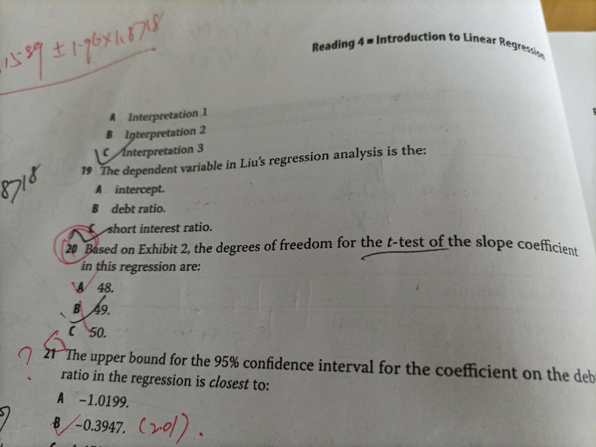 你好这里第20题,我有一点糊涂了,算自由度,但是这里是一元回归,虽然表2有列了两个参数,但是那个是截距b0,应该和x取值没有关系吧,本文是取了50个x及对应y,则我们求斜率x前面的系数b1,自由度应该是49吧