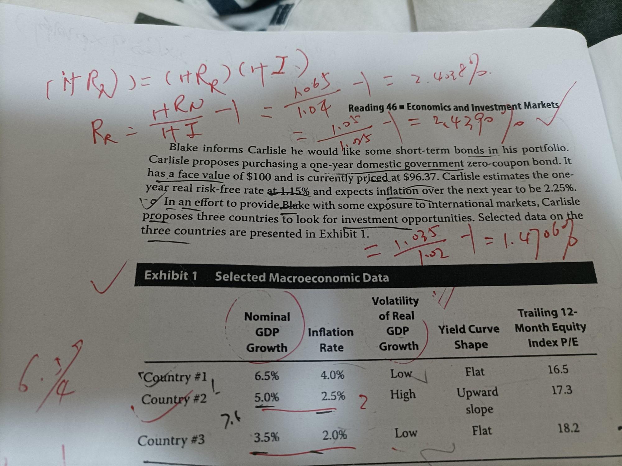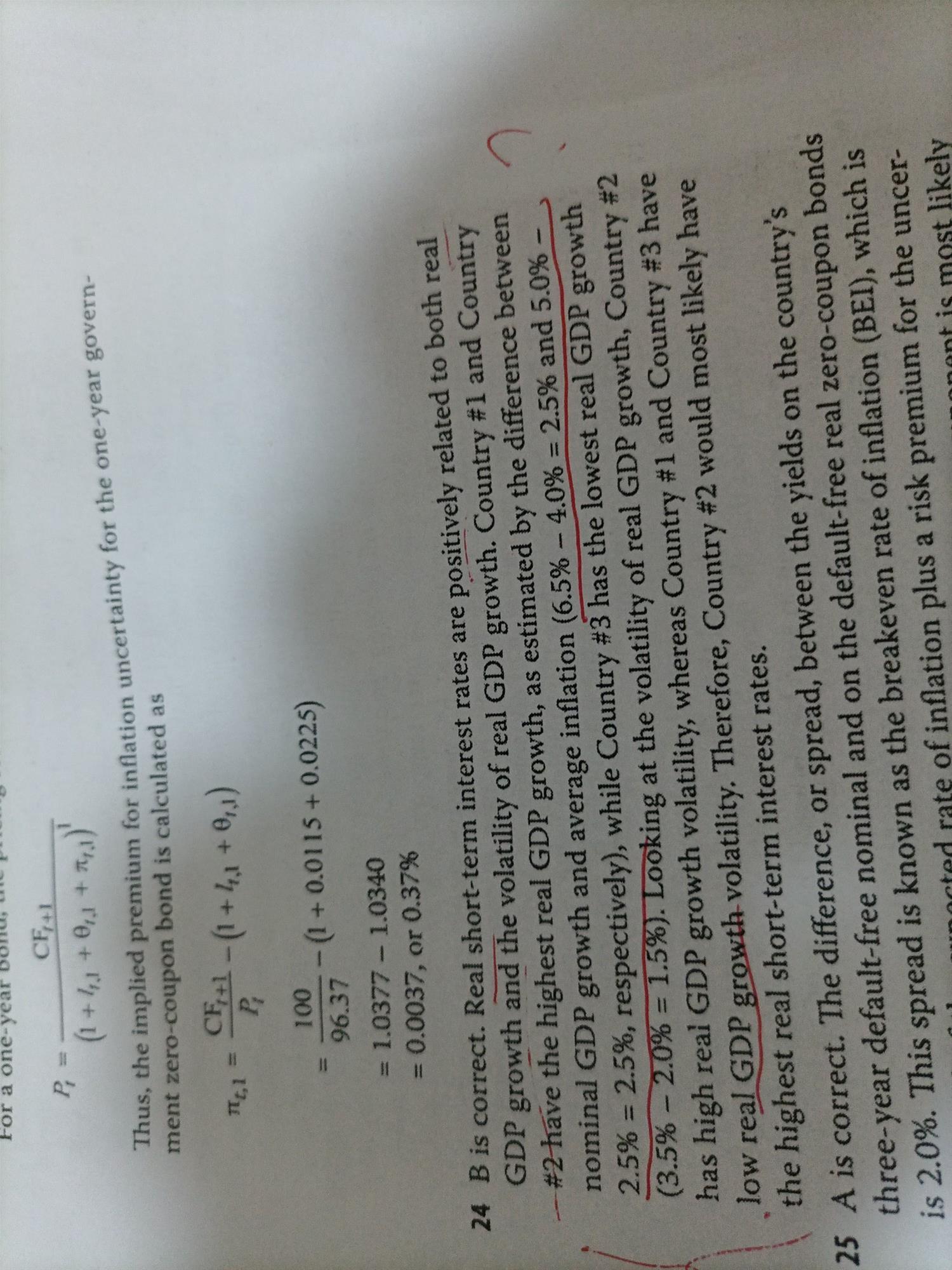 你好,我问的这个问题,是373页24题,我们在一级应该是债券学过,1*名义利率=(1*实际利率)(1+通胀) 那短期实际利率,不就两个相除减一呢,见我红笔写的计算各结果。而解答这里,用减法,不是用除法了?虽然最后都是选择B