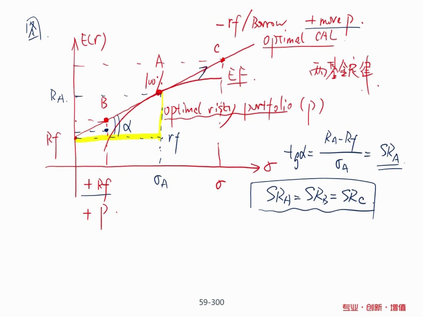 你好,这里我第三次再听了,说到投资在A点,没有现金(无风险资产)部位?但是A点是和风险资产相切,最优点,但是也是在这条线上,也有无风险现金资产吧,