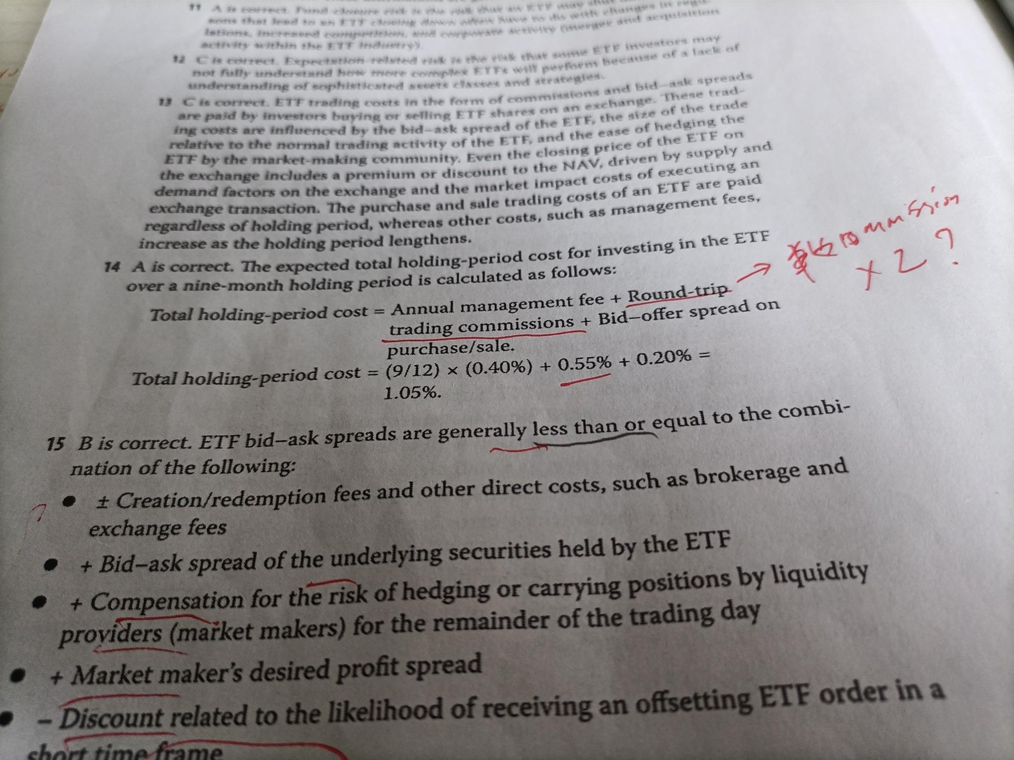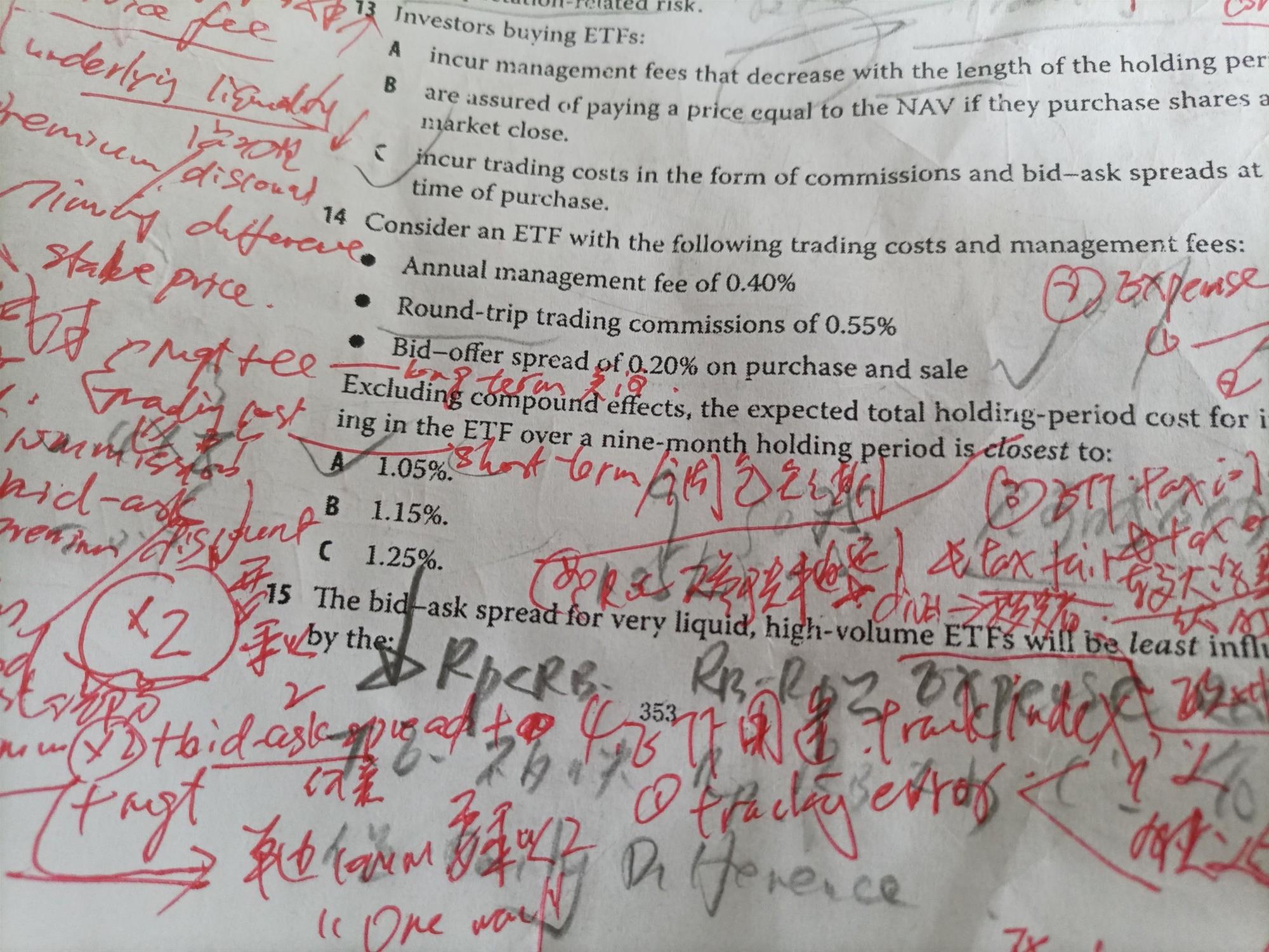 你好,组合这个科目是所有科目最难的,因为我没有买过股票基金,也不了解ETF,完全是听课才知道,例如本题第14题,听课里面说,COMM乘以2,单边ONE WAY,而这里没有?麻烦解释下交易费用,谢谢