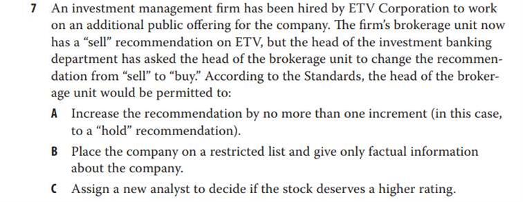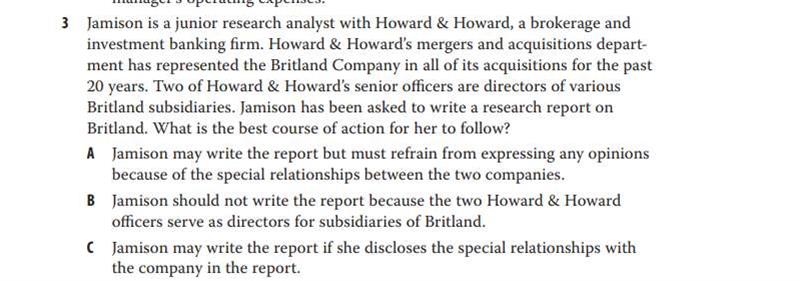 请问ethics课后题第三题为什么不可以选A呢,老师上课的讲义里提到遇到利益冲突有三种做法:1.披露;2.有利益冲突的公司放入restricted list,以后只能陈述事实不能发表个人观点;3.直接拒绝,A的做法不就是不发表个人观点吗?