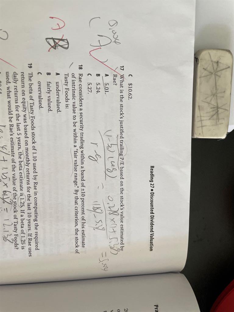 你好老师,原版书课后题第256页第17题,我铅笔写的那个解答可以吗,算出来跟答案有出入,为什么不对?也是用的trailingPE的公式,谢谢