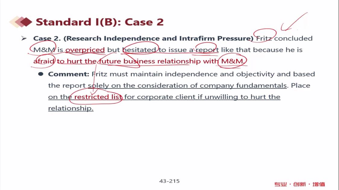 老师您好,关于restricted list,您看我理解的对不对哈, 1.如果担心损害关系,一开始就把相关公司加入restricted list,然后分析的时候,只发表事实不发表观点。 2.如果已经分析了,发现overpriced(例如此例子),此时由于担心损害关系所以说我就什么都不作为了,这是不对的;此时如果说放入restricted list,只发表事实不发表观点是不是也不对呢? 请老师帮忙看一下,谢谢!