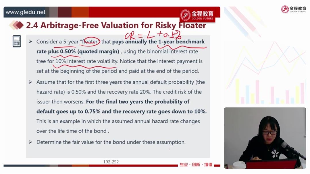 老师您好,这里的例题都是五年期的利率二叉树为risky bond估值FV VND CVA,您能帮忙找一道两年期利率二叉树为三年期Risky bond,分别为coupon paying和floater估值的题目并有详细阶梯步骤的吗?非常感谢