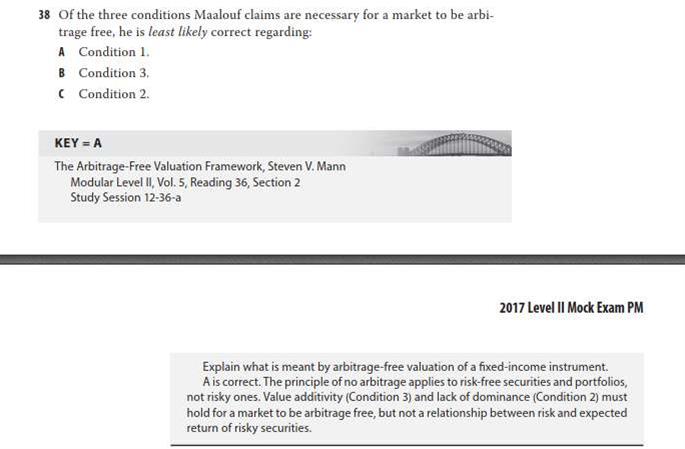 老师好 2017年模考下午第38题。 是不是 non arbitrage就两个特征 lack of dominance and value additivity. 这里的condition 1 是指风险越高,expected return 越高。 是不是如果不是考non arbitrage 特点的情况下,这句是对的?谢谢。