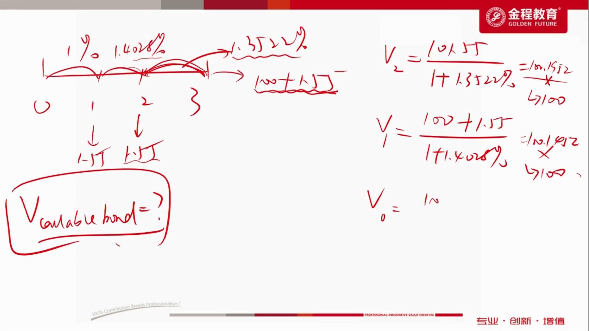 老师,Reading34的第三个case(John Smith)的第23题,对于callable bond用远期利率去估值,当价格大于100时取100,我能理解这其实跟利率二叉树是一个逻辑,但是我突然好像不明白含权债券为什么能用这样思想去估值?不含权债券用利率二叉树估值的思想是:不同时间段的现金流用对应的利率折现,依次往前递推直到求出现值,对吗?n那若是一个callable bond,先假设它一直没被call回,计算最后一期现金流的现值若是大于100,那么它一定会被call 回,所以只能取到100,再往前折,若是又大于100又被call回又是只取到100,这样依次往前,那这个callable bond 不是被多次call回了吗?这不可能呀