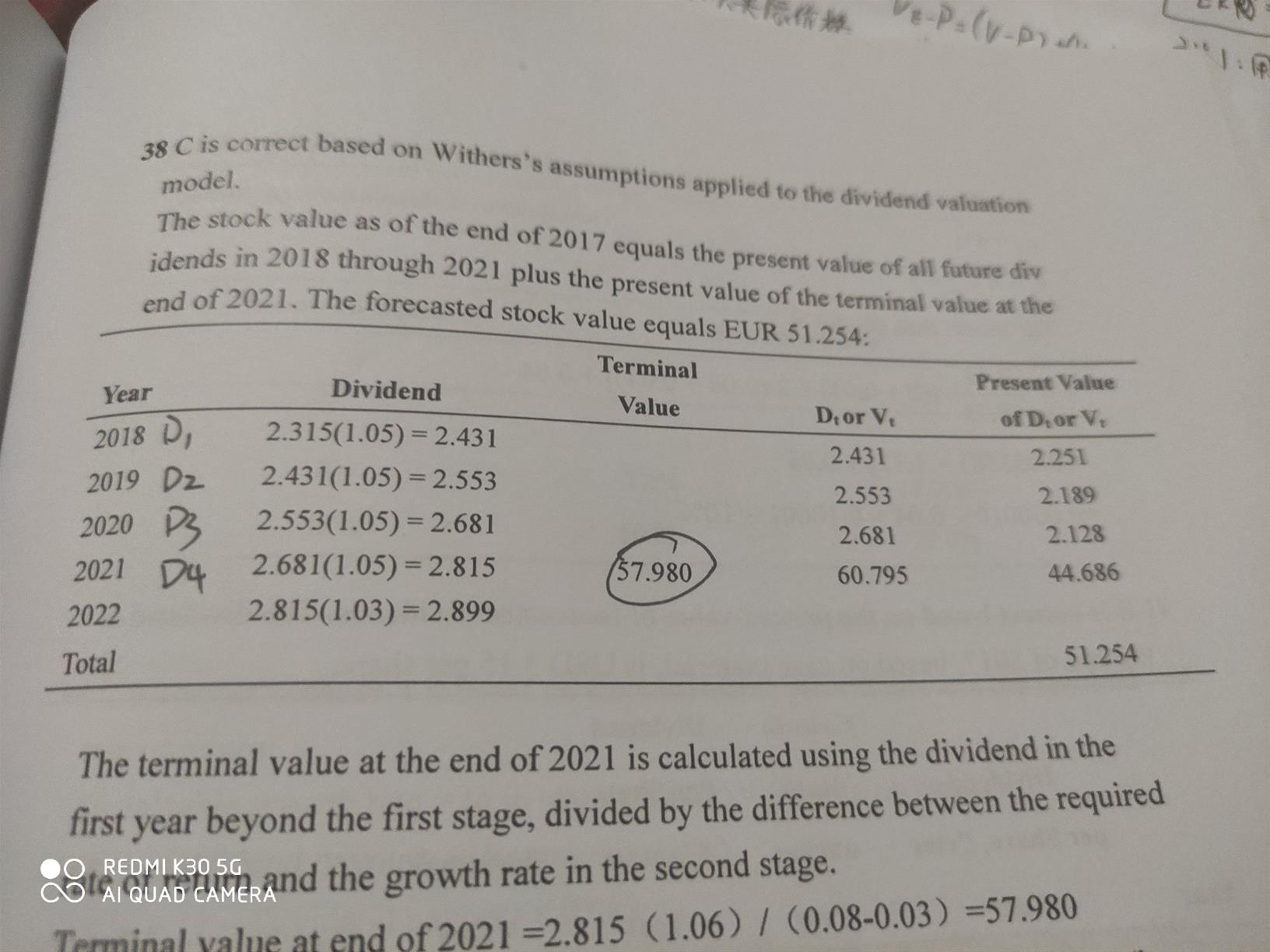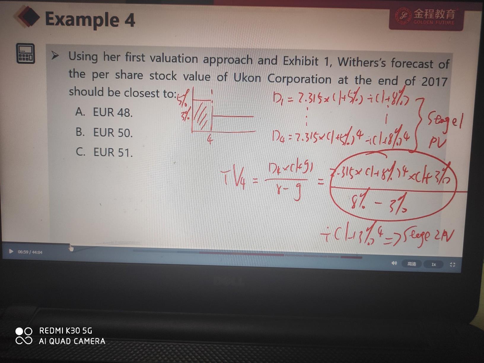terminal value57.98 折回第一阶段是不是应该是 57.98除以 1+8%的4次方?我算的市42.617,答案是44.686,哪里算错了