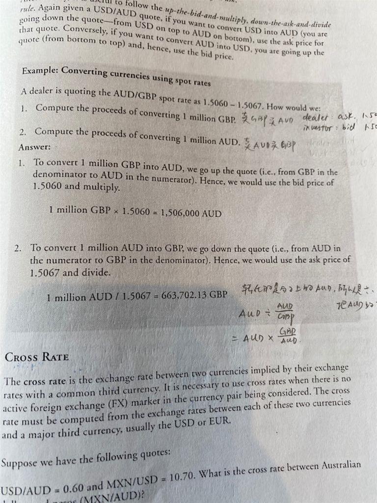 老师你好,汇率这里notes上这道例题第二问,怎样用像第一问这个思路去做:第一问,卖GBP买AUD,dealer角度用ask price,所以investor角度用bid price 1.5060。第二问是转换price currency AUD,该怎么做?之前讲的买、卖都针对的是base currency。